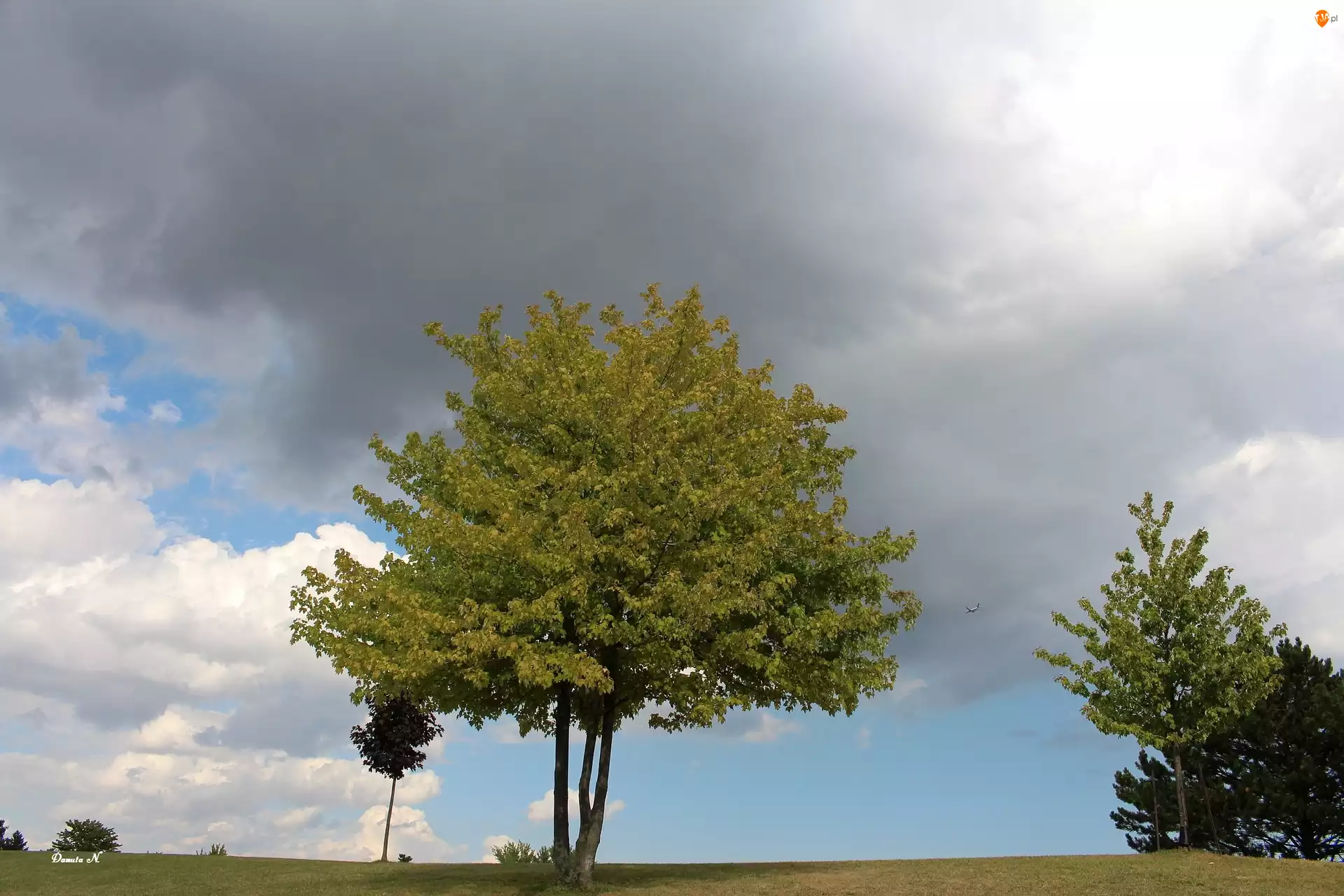 Niebo, Wzgórze, Drzewa, Polana, Zachmurzone, Chmu