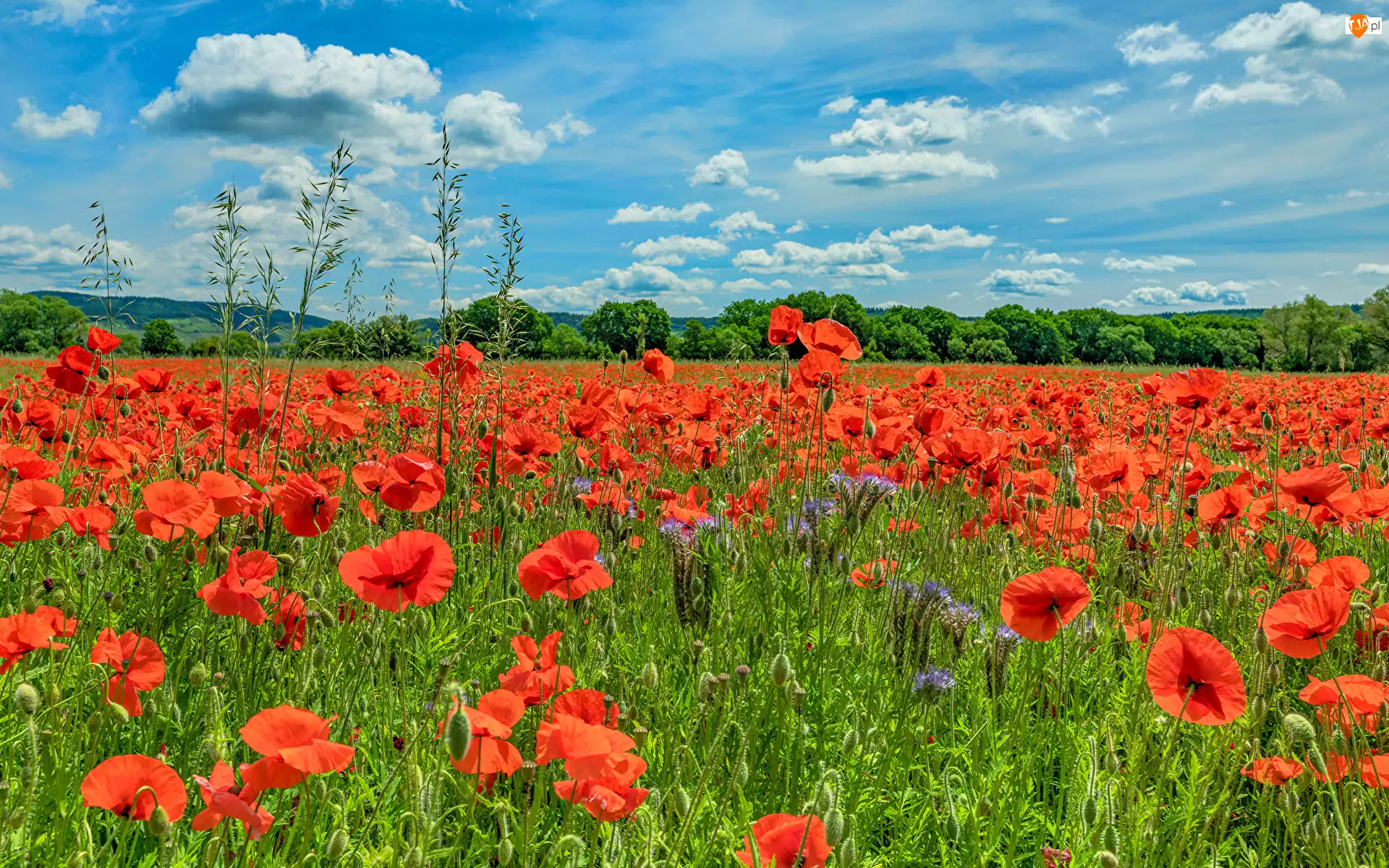 Pole, Maki, Chmury, Łąka, Białe, Niebo, Drzewa
