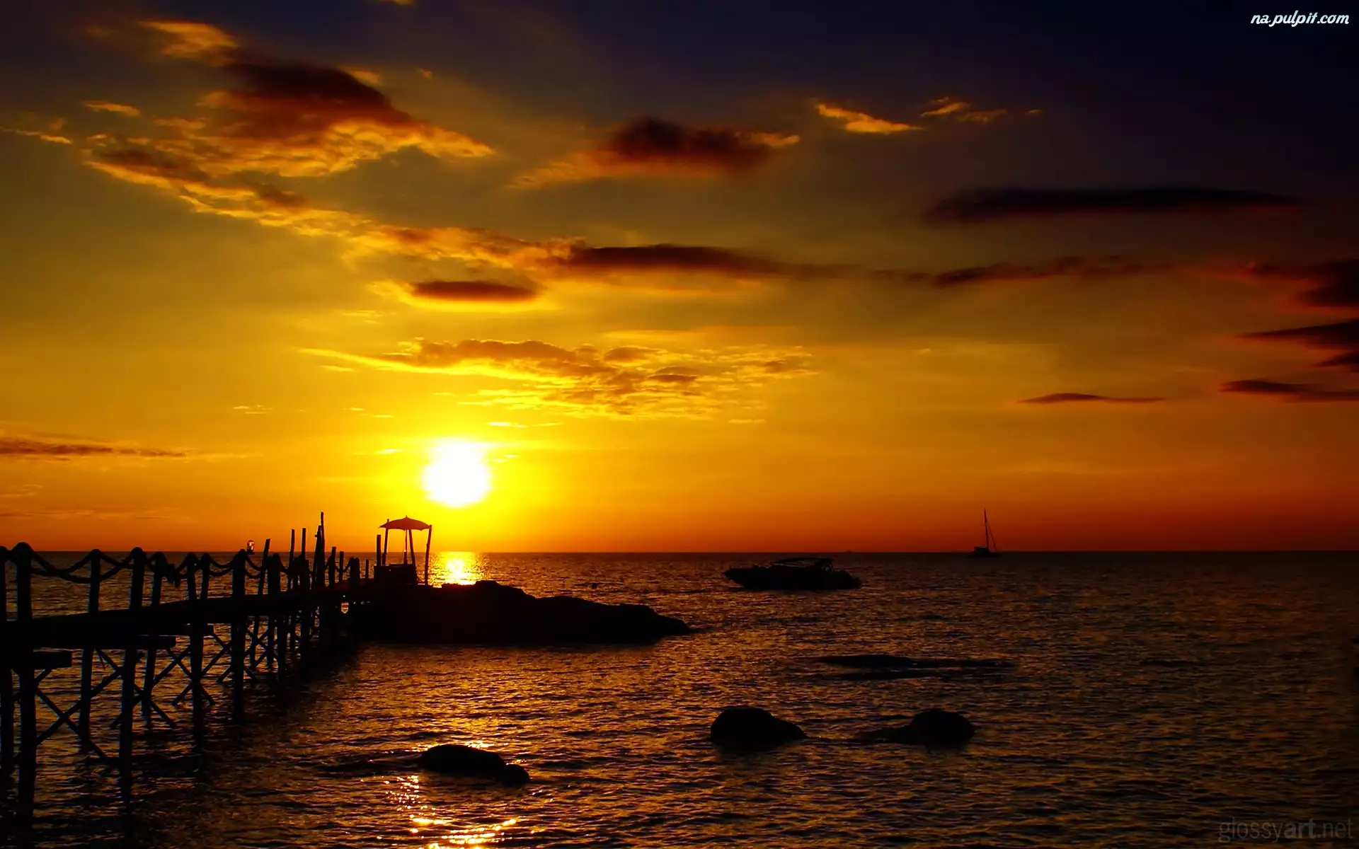 Molo, Morze, Chmury, Slonca, Niebo, Zachod