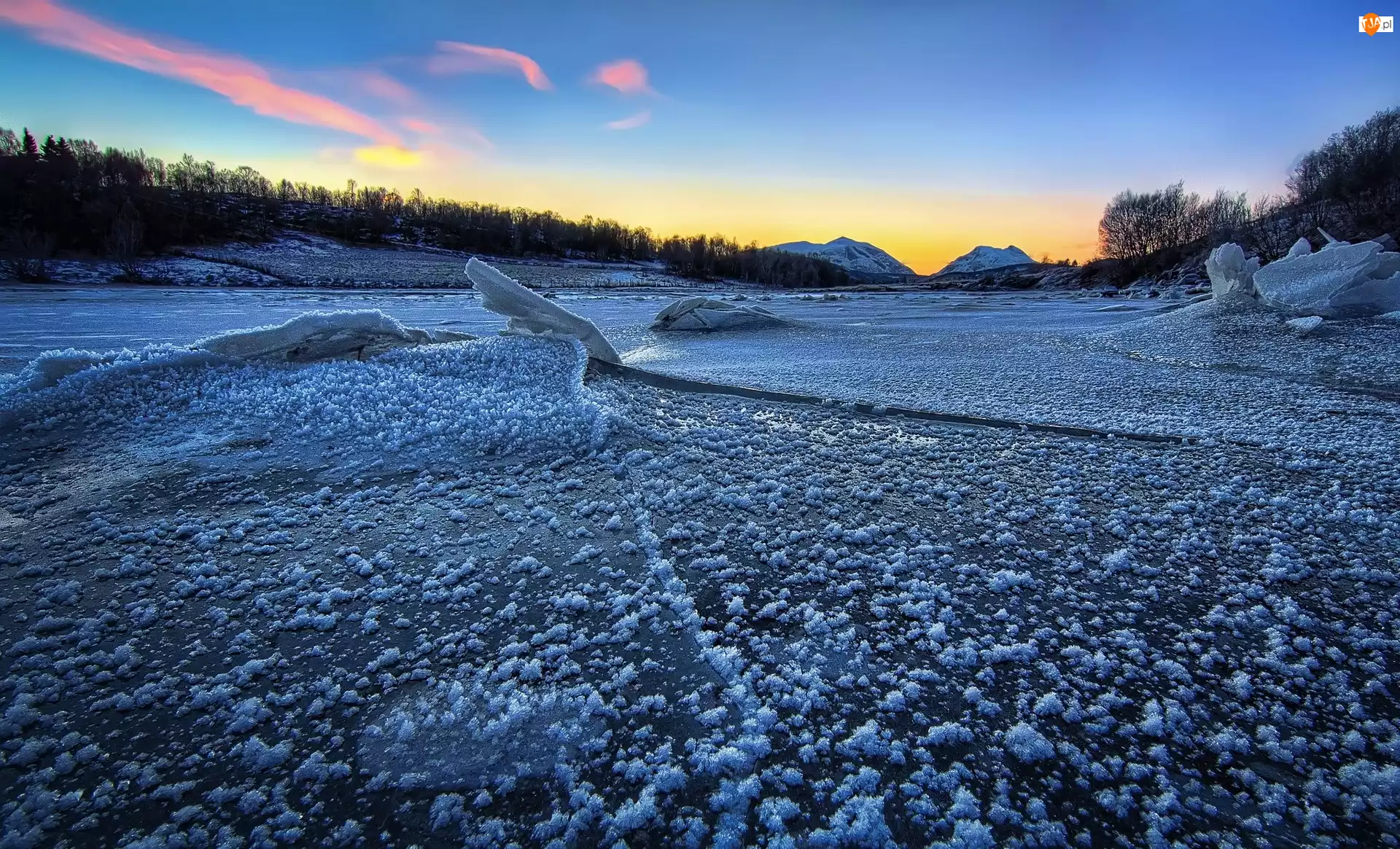 Niebo, Zachód, Zamarznięte, Słońca, Jezioro