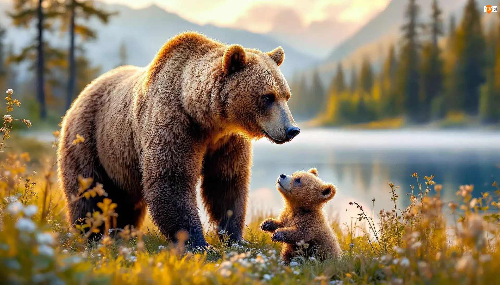 Niedźwiedź i mały niedźwiadek nad jeziorem z g