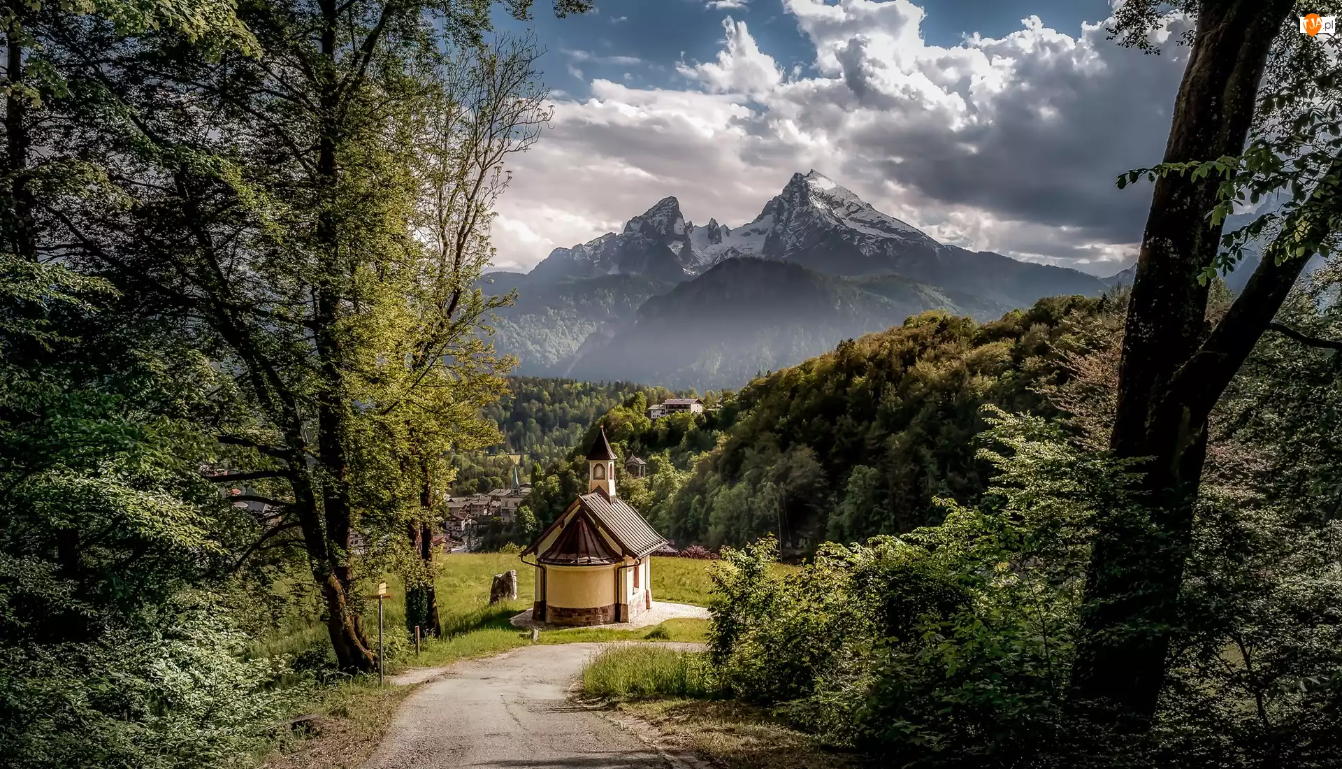 Niemcy, Chmury, Berchtesgaden, Domy, Drzewa, Góry Alpy, Kapliczka, Lasy, Kirchleitn Kapelle, Bawaria