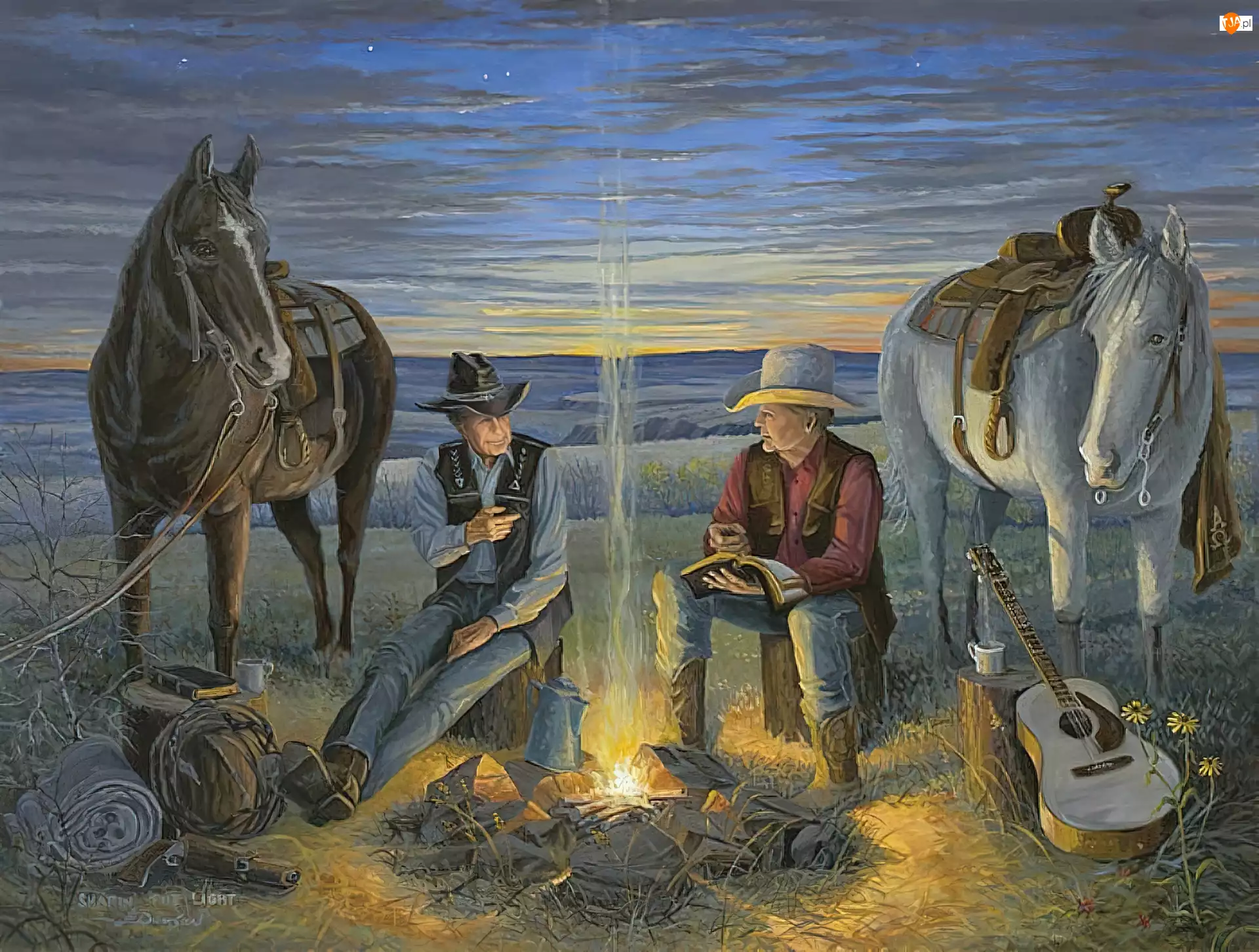 Noc, Kowboje, Ognisko, Konie, Gitara