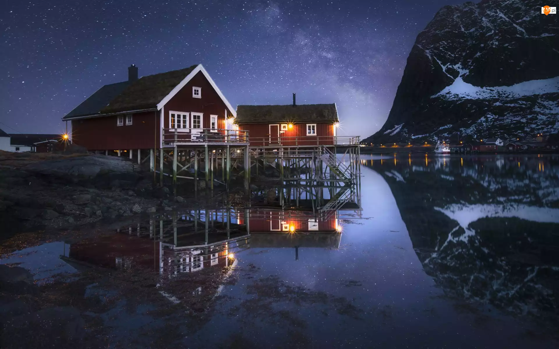 Noc, Norwegia, Domy, Wioska Reine, Góry