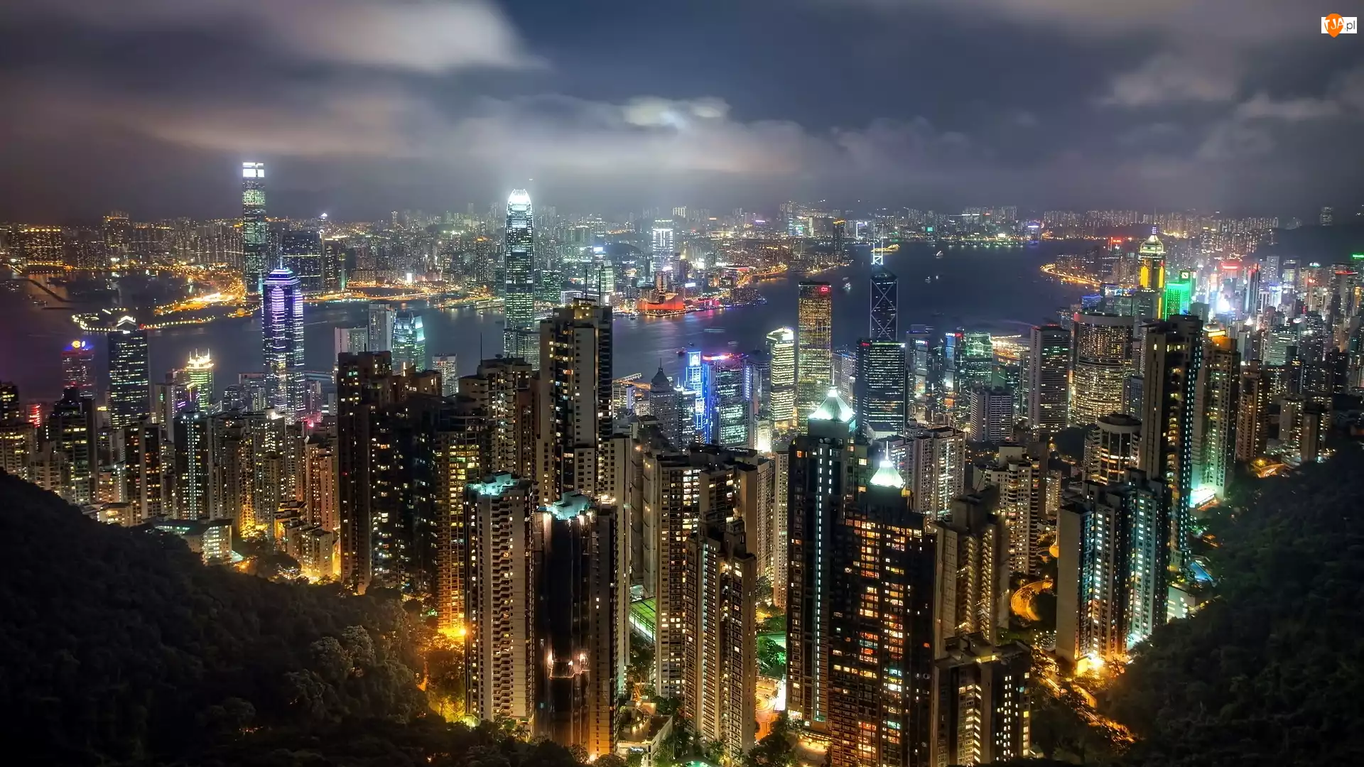 Nocą, Hong Kong, Chmur, Drapacze, Miasto