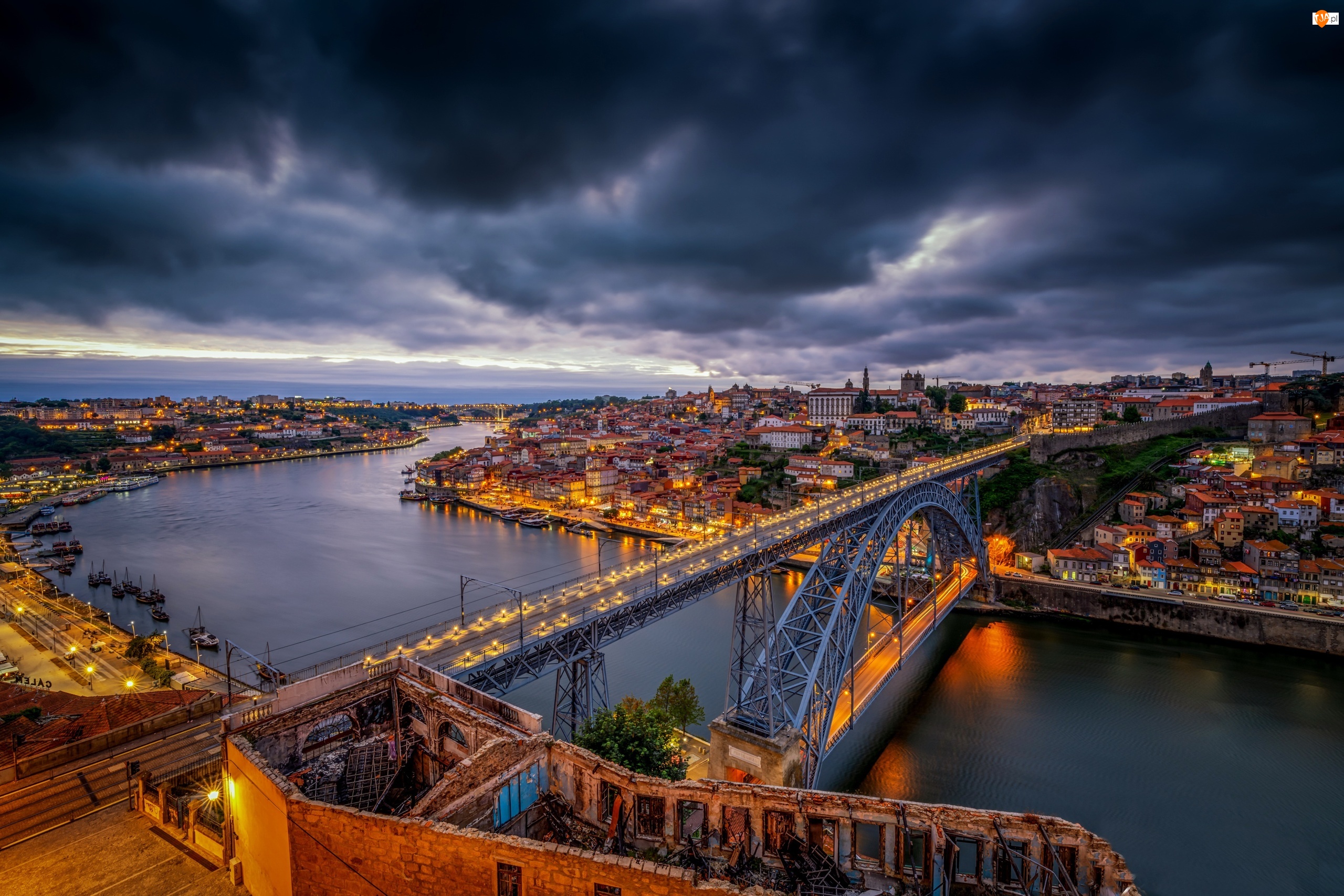 Porto, Portugalia, Most Ponte Dom Luis I, Chmury, Rzeka Duero, Ciemne