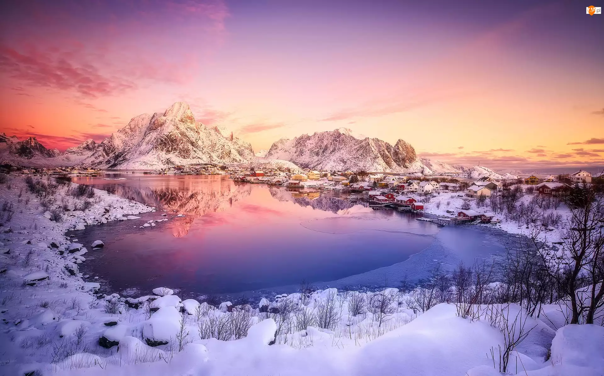 Zima, Góry, Wioska Reine, Skały, Norwegia, Domy, Lofoty, Zatoka