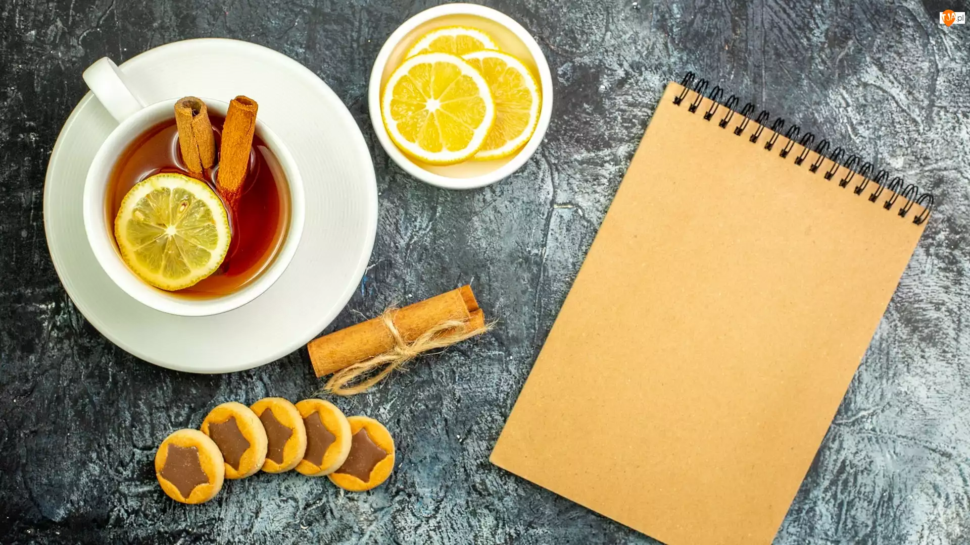 Ciasteczka, Notes, Filiżanka, Cynamon, Herbata, Cytryna