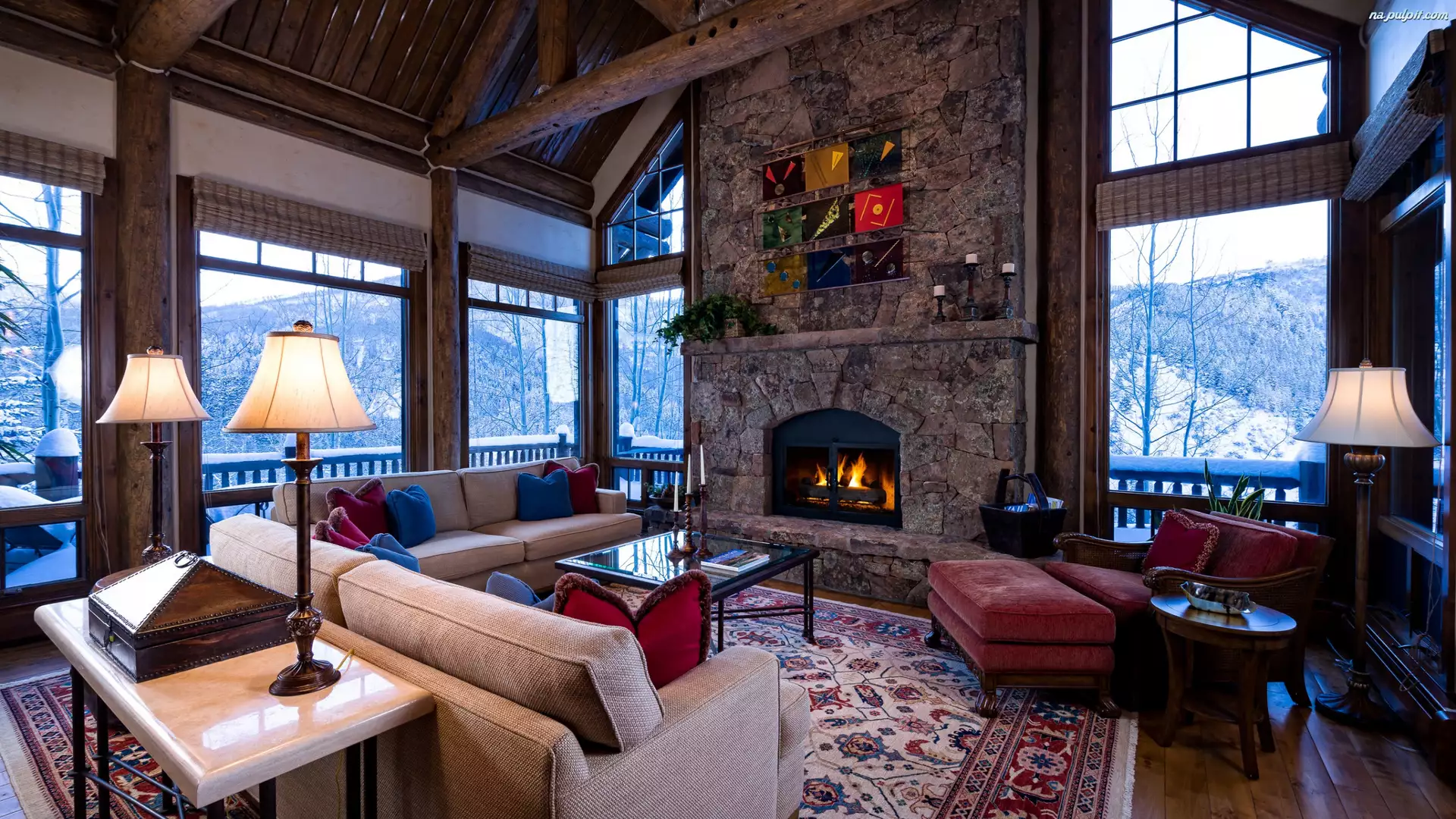 Kominek, Salon, Okna, Lampy, Duże, Kanapy