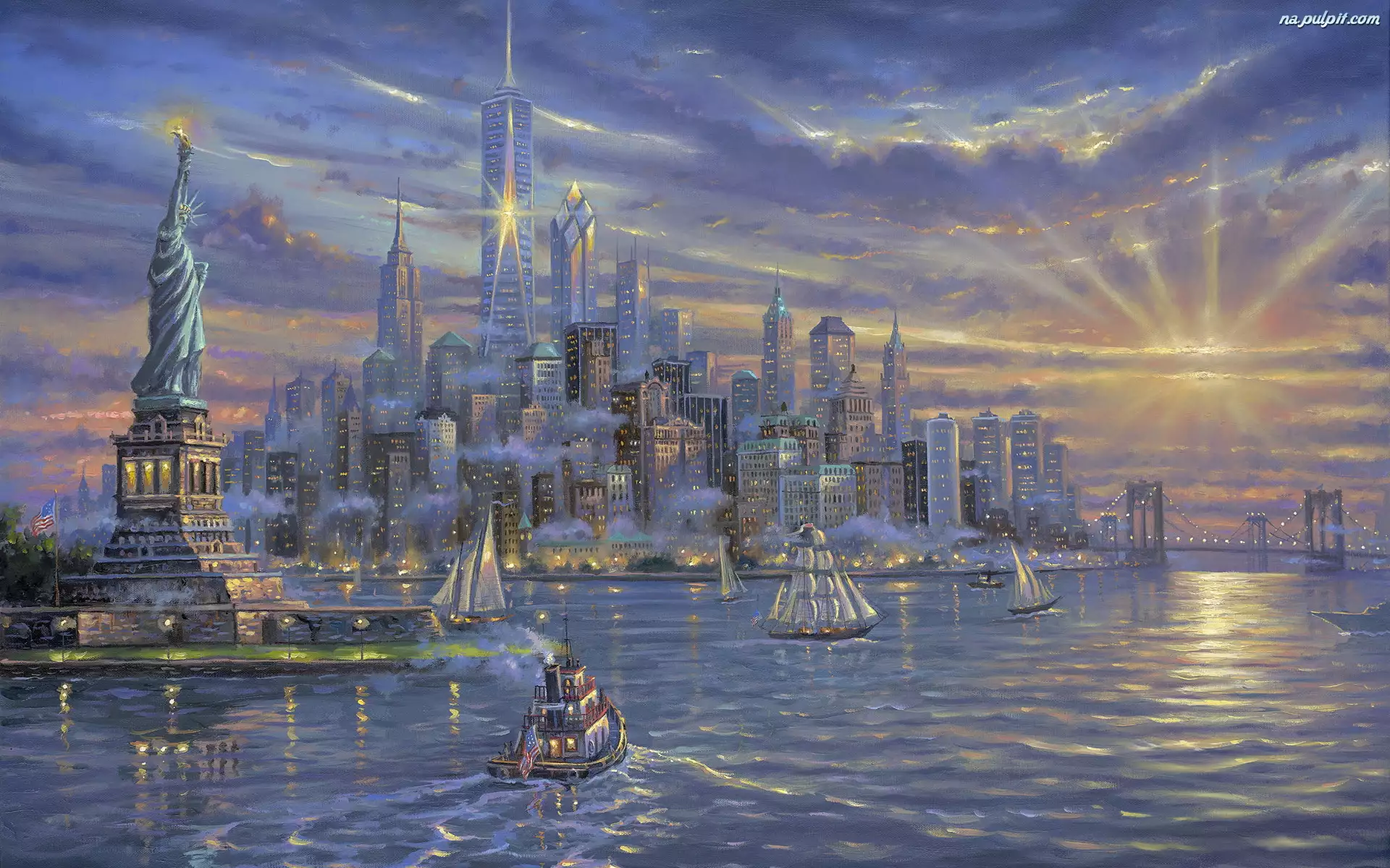 Statki, Obraz, Zatoka, Budynek, Jachty, Malarstwo, Nowy Jork, Zachód słońca, Robert Finale, Statua Wolności, Morze, Żaglówki