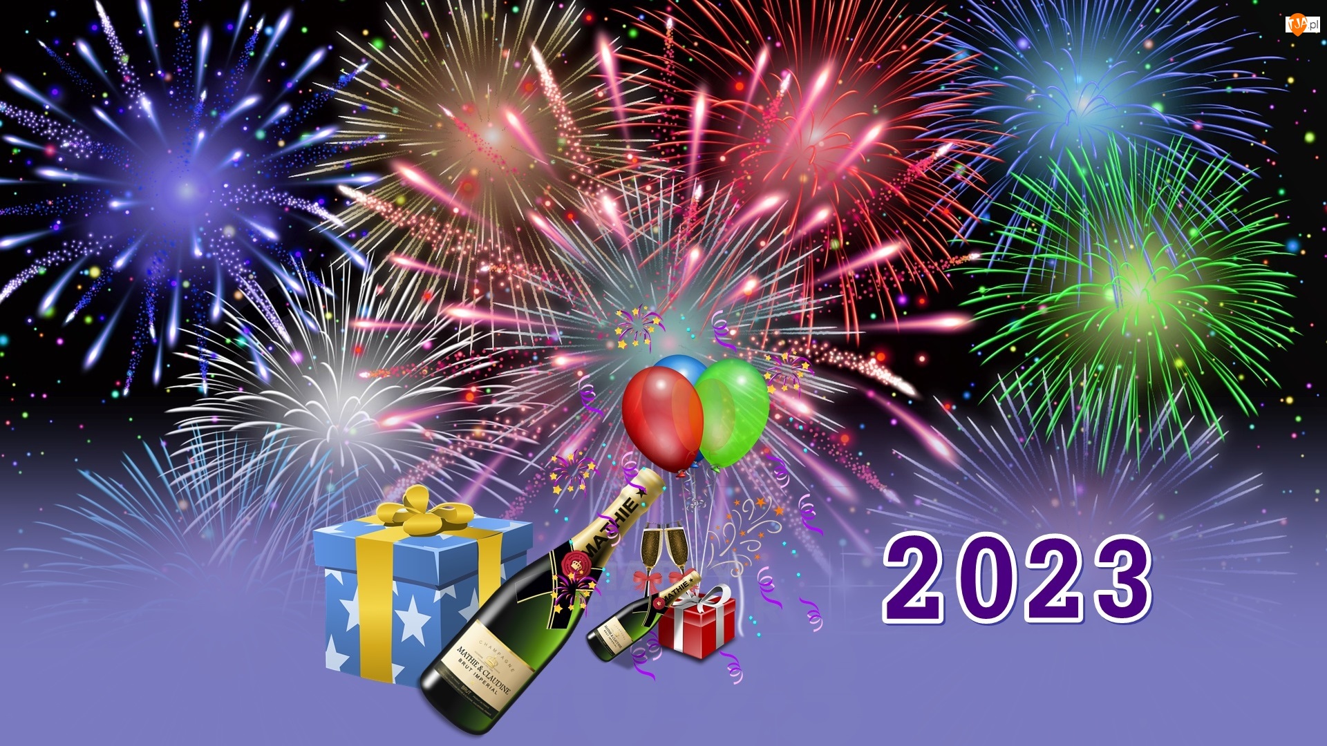 Nowy Rok, Grafika, Fajerwerki, Balony, 2023, Szampan