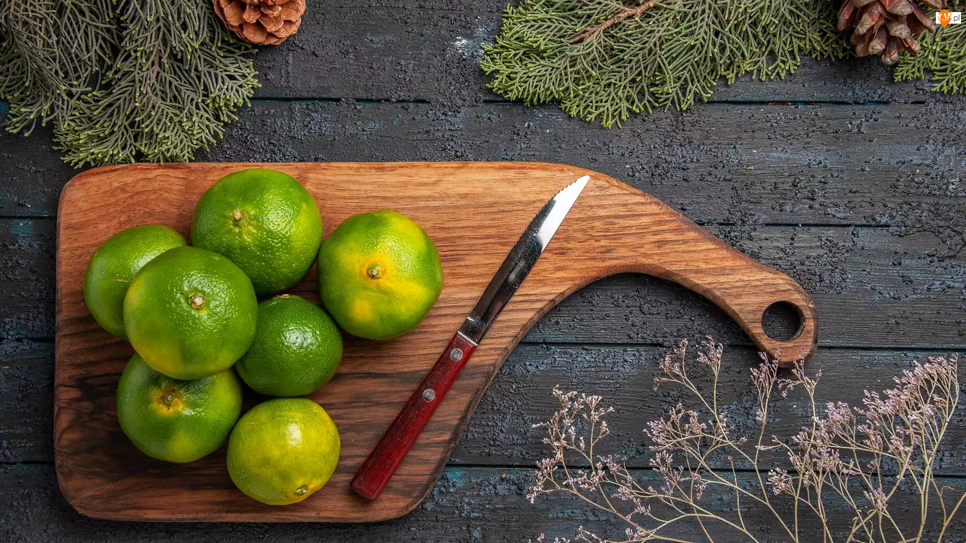Nóż, Gałązki, Deska, Limonki, Szyszki