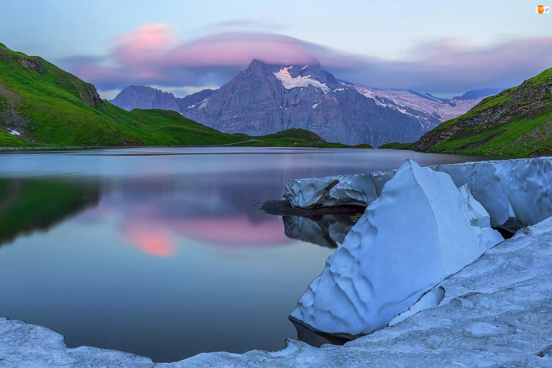 Śnieg, Jezioro Bachsee, Góra Wetterhorn, Kanton Berno, Góry, Zima, Szwajcaria, Alpy Berneńskie