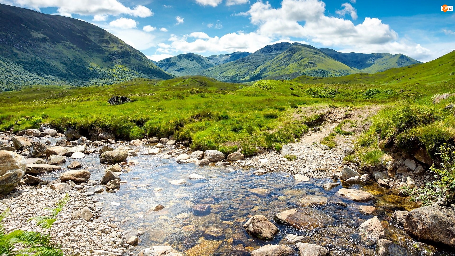 Obłoki, Góry, Strumyk, Łąka, Kamienie