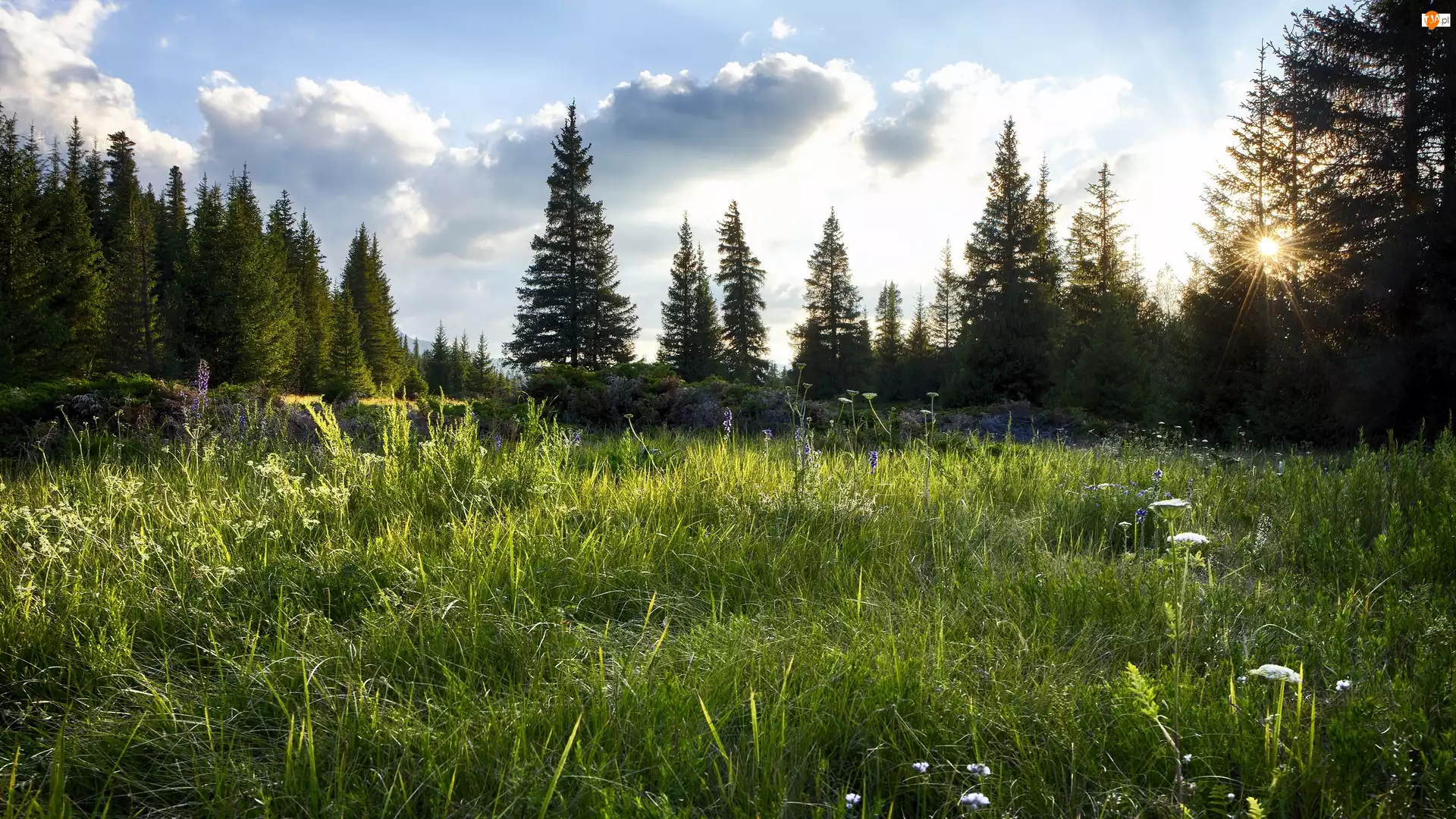 Trawa, Drzewa, Łąka, Promienie słońca, Kwiaty, Chmury