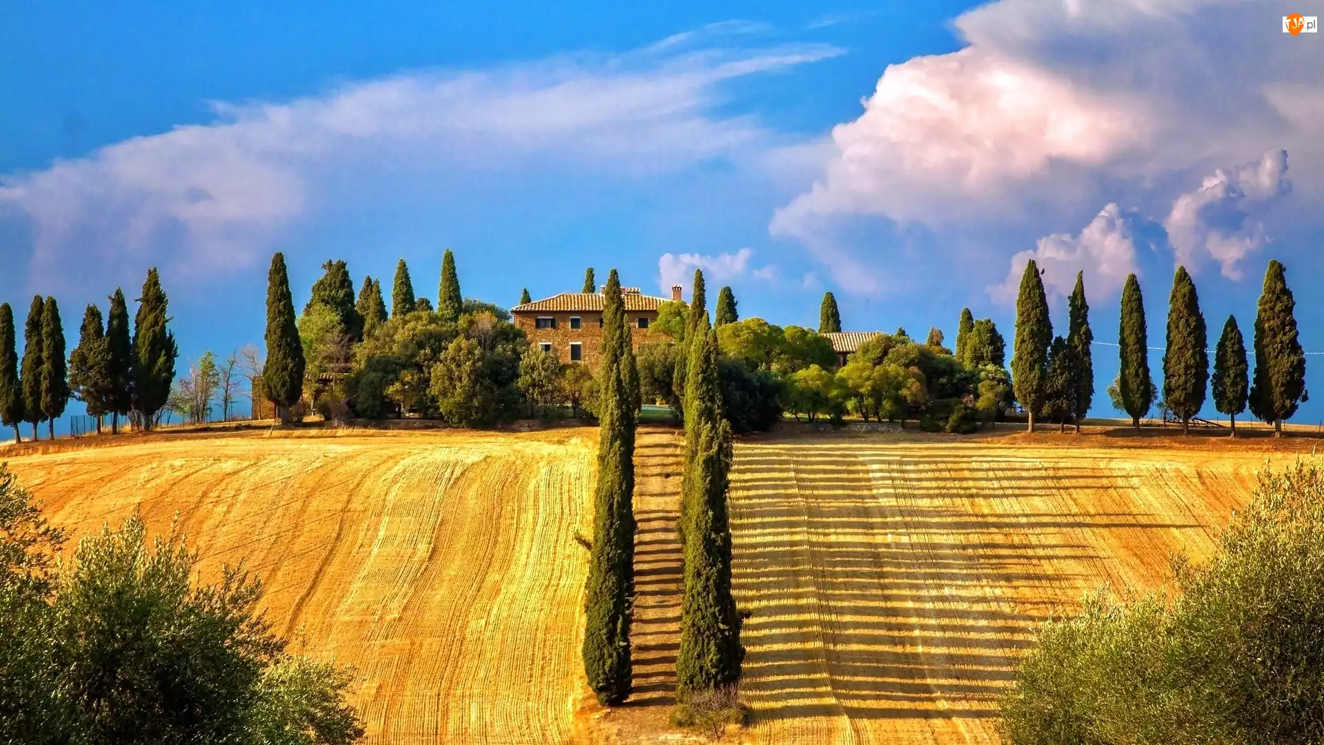 Obłoki, Pola, Dom, Toskania, Cienie, Droga, Cyprysy