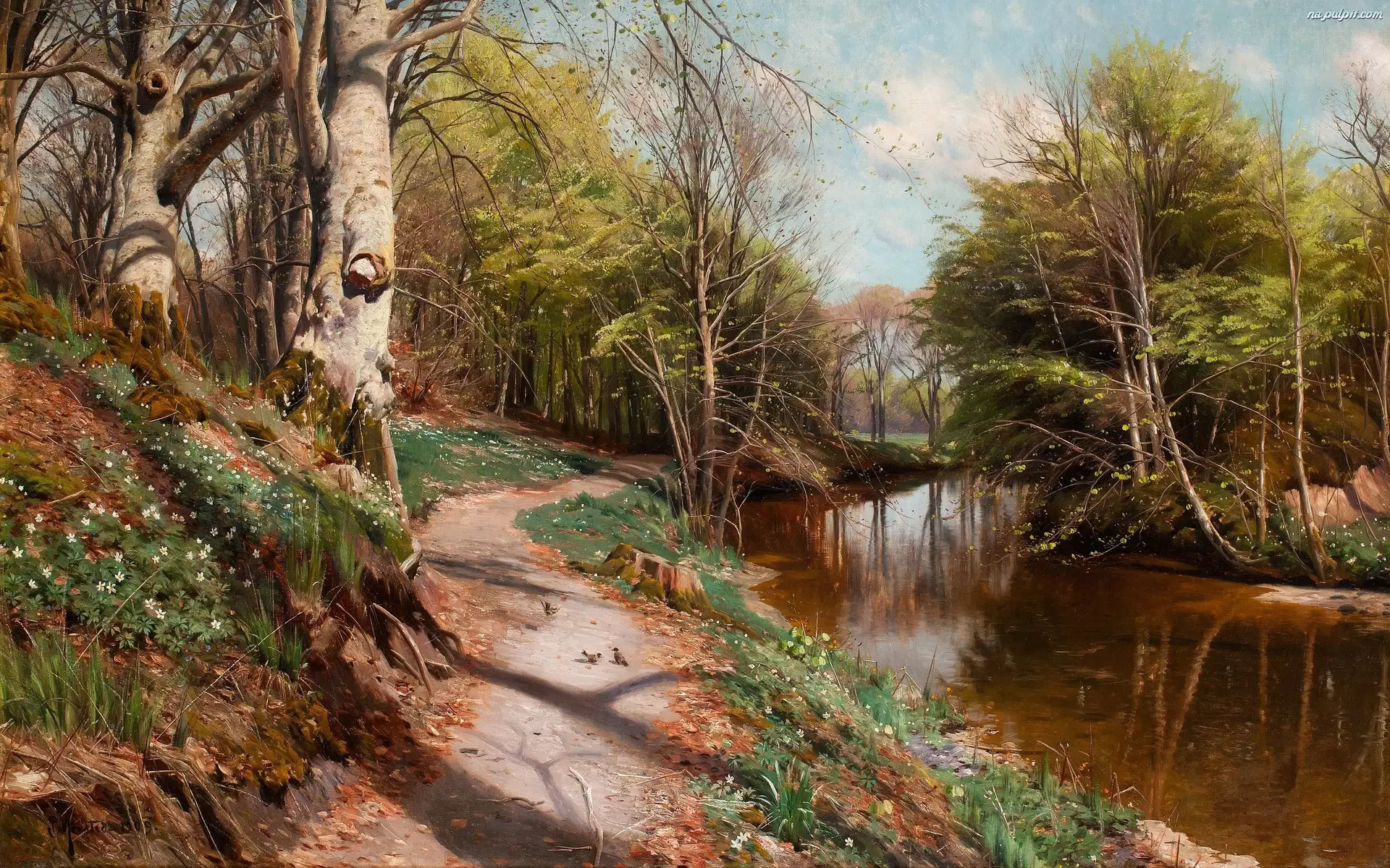 Drzewa, Peder Monsted, Droga, Rzeka, Malarstwo