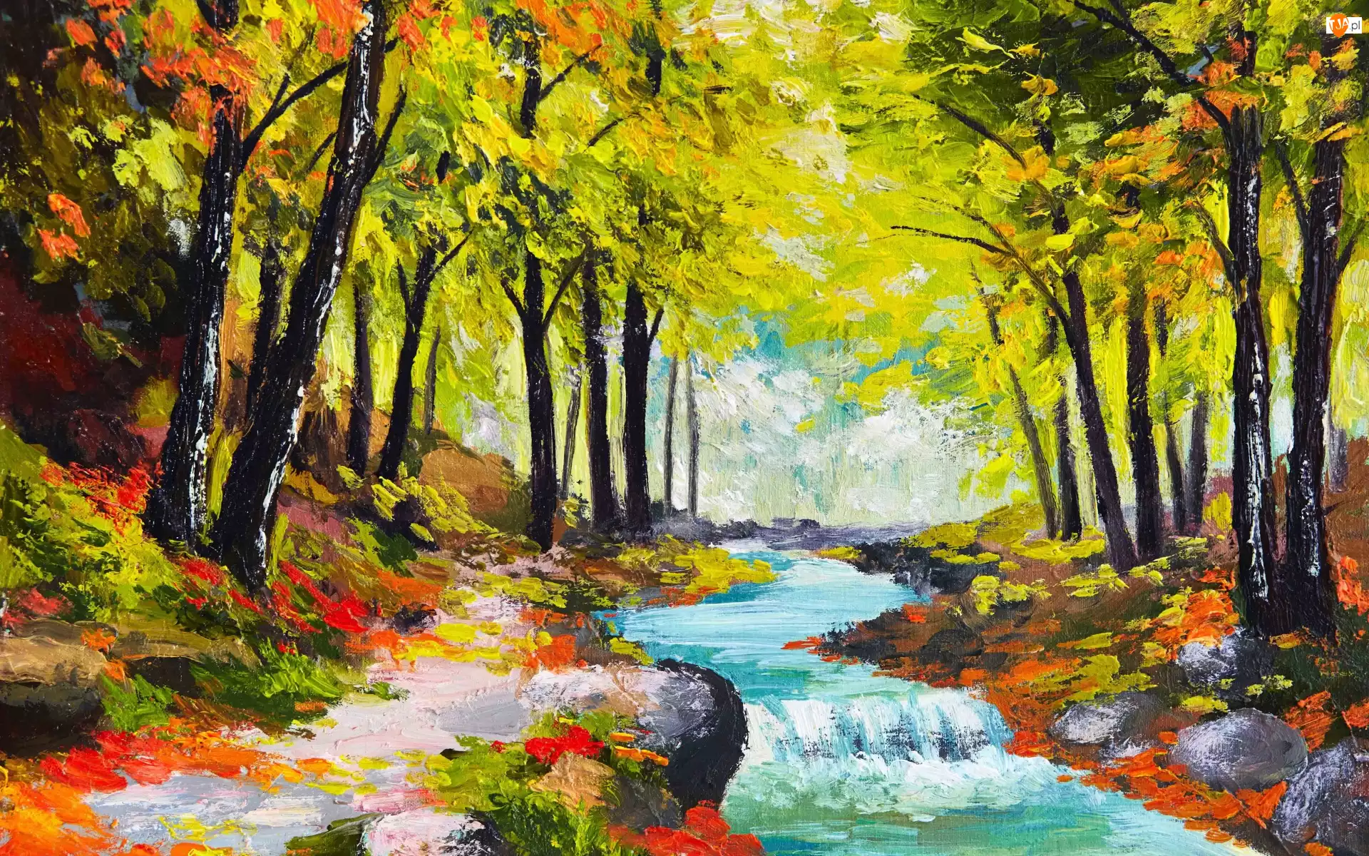 Kwiaty, Obraz, Las, Rzeka, Kamienie