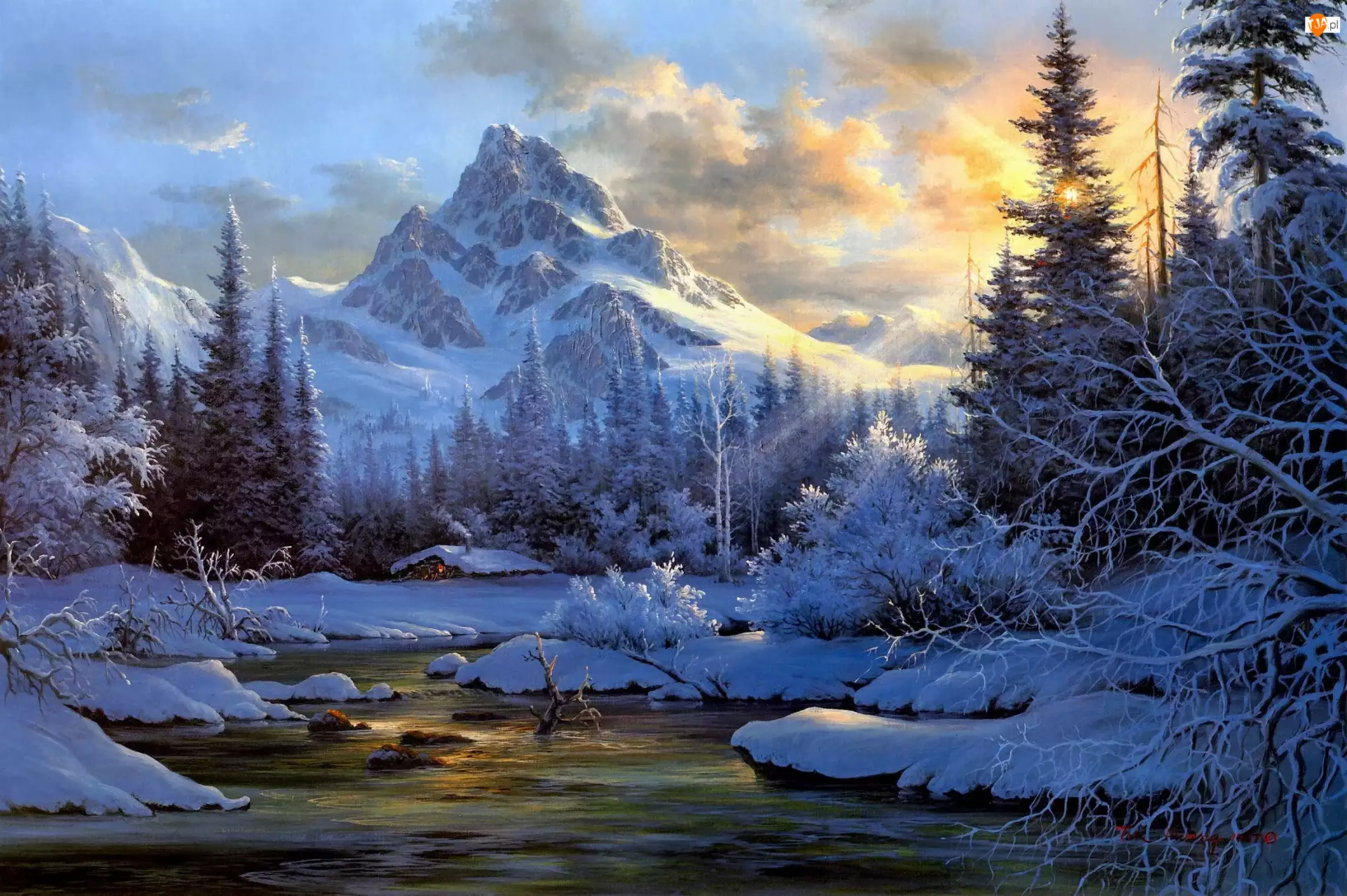 Tok Hwang, Malarstwo, Obraz, Rzeka, Zima, Góry