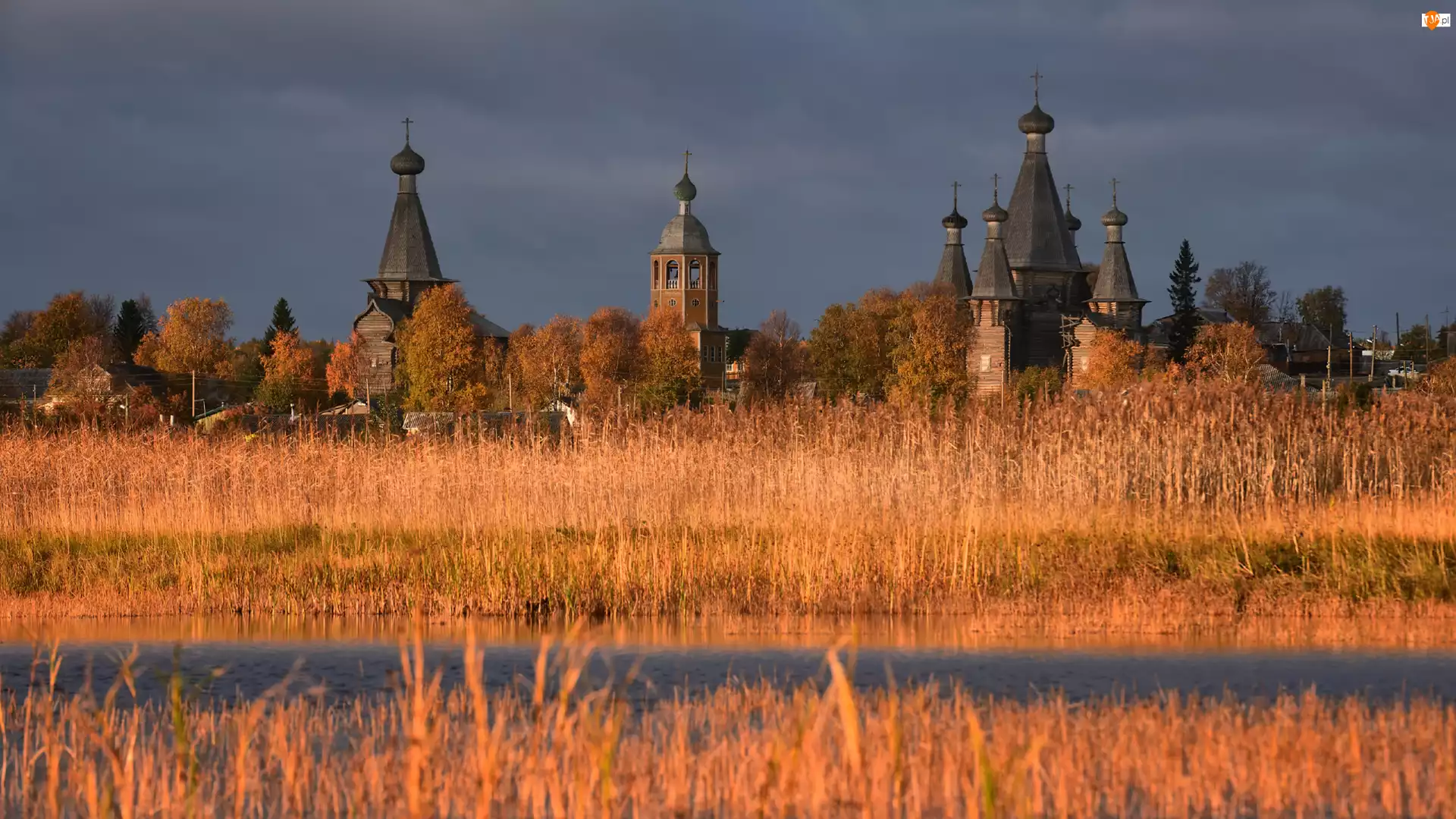 Obwód archangielski, Nenoksa, Drzewa, Rosja, Domy, Cerkiew, Jesień