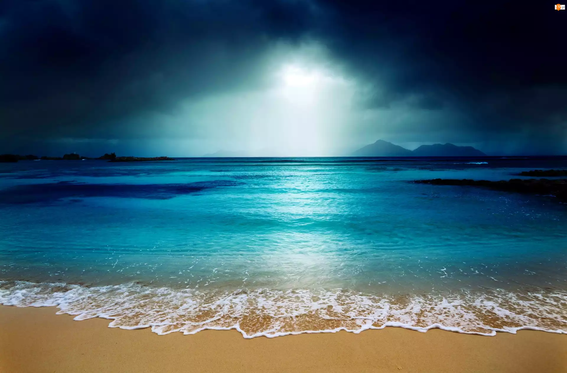 Ocean, Poświata Księżyca, Plaża, Noc