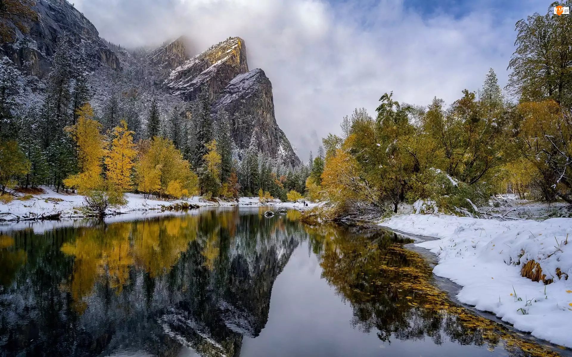 Odbicie, Drzewa, Chmury, Stany Zjednoczone, Park Narodowy Yosemite, Góry, Merced River, Ciemne, Rzeka, Śnieg, Kamienie, Kalifornia