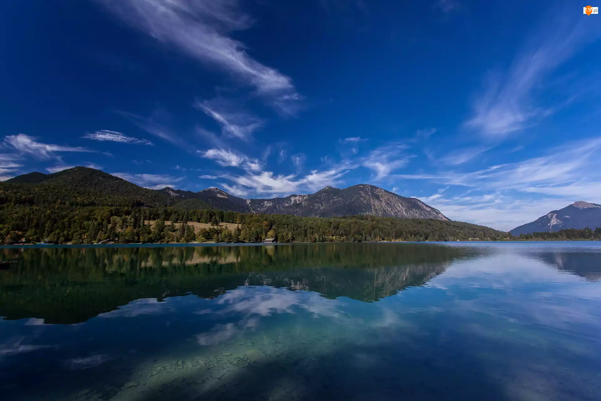 Bawaria, Jezioro Walchensee, Odbicie, Niemcy, Drzewa, Alpy Bawarskie, Góry