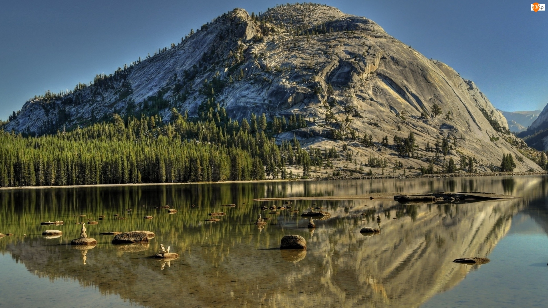 Odbicie, Góry, Jezioro, Drzewa, Kamienie