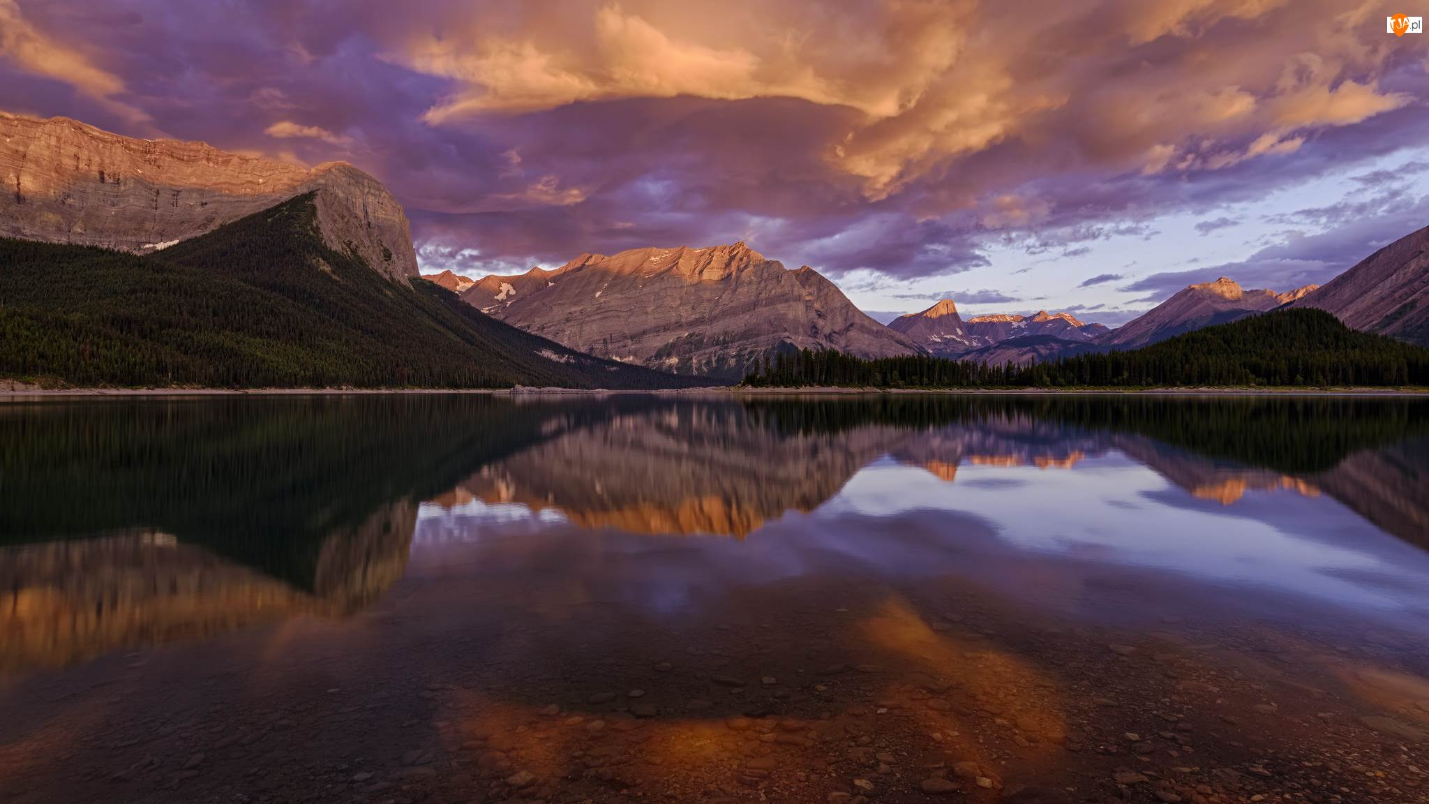 Odbicie, Jezioro, Drzewa, Prowincja Alberta, Upper Kananaskis Lake, Chmury, Kanada, Góry