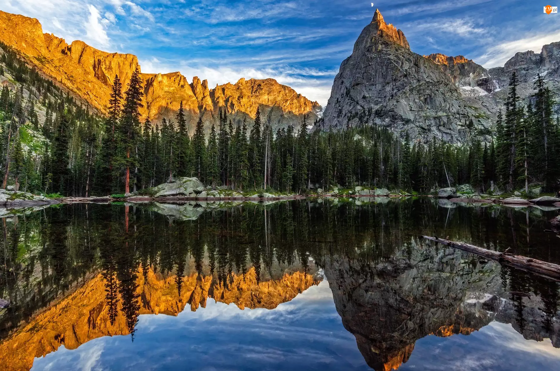 Odbicie, Jezioro, Mirror Lake, Stany Zjednoczone, Szczyt, Góry, Indian Peaks Wilderness, Lone Eagle Peak, Stan Kolorado, Drzewa