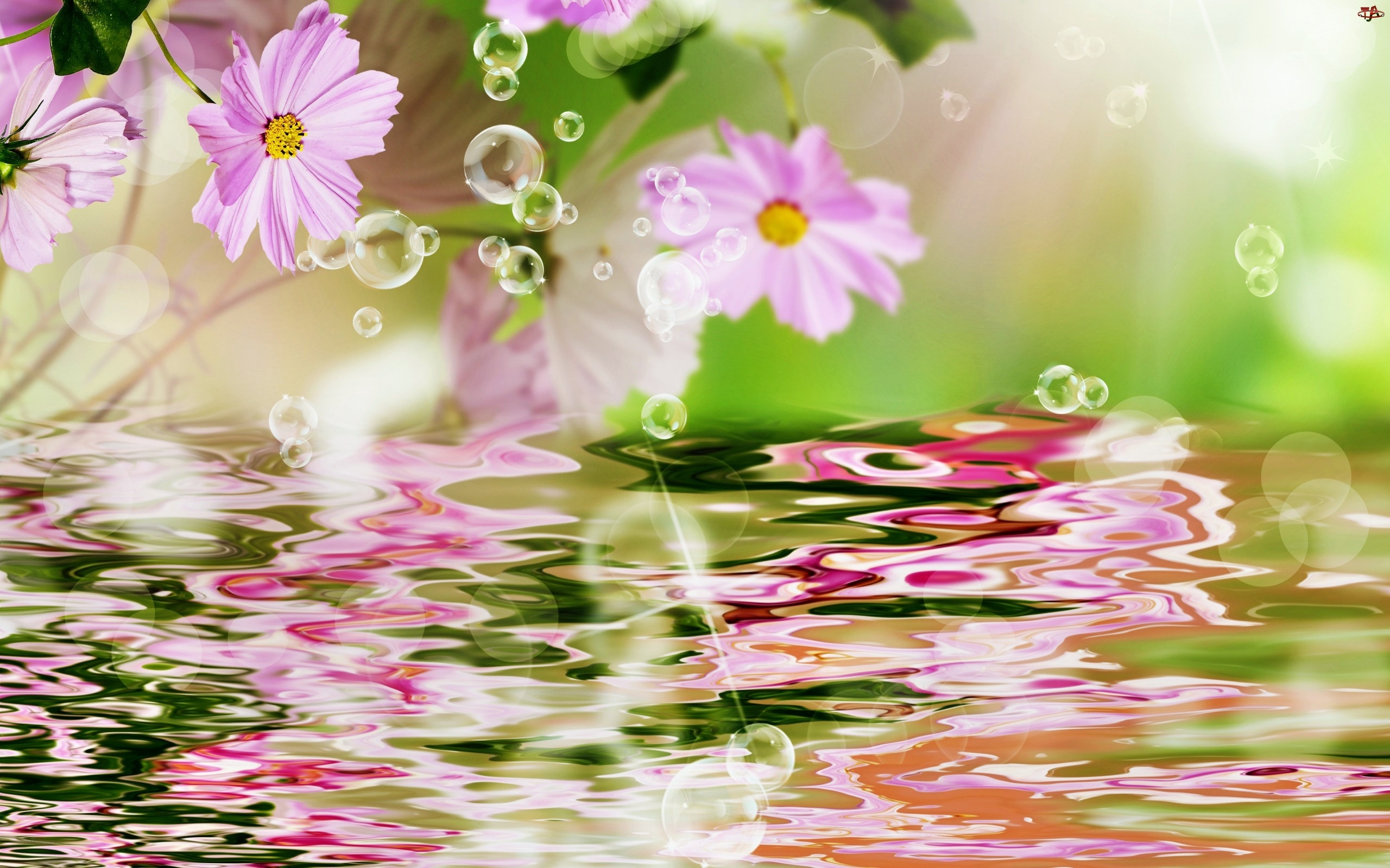 Odbicie, Kwiaty, Rozmyta, Kosmea, Woda
