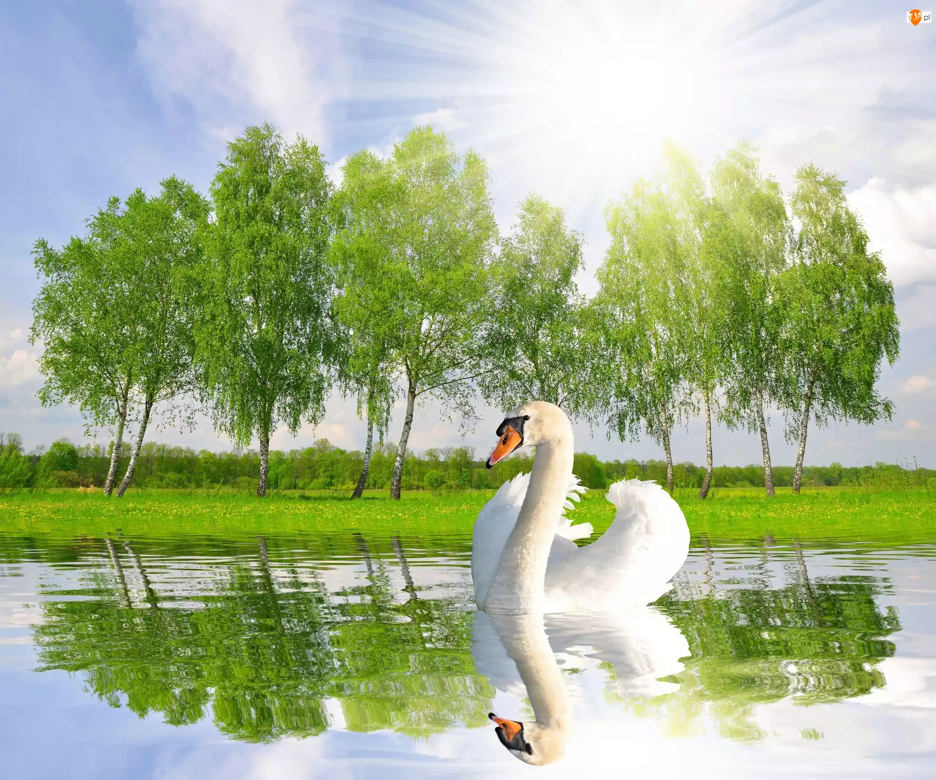 Odbicie, Łabędz, Promienie Słońca, Drzewa, Wod