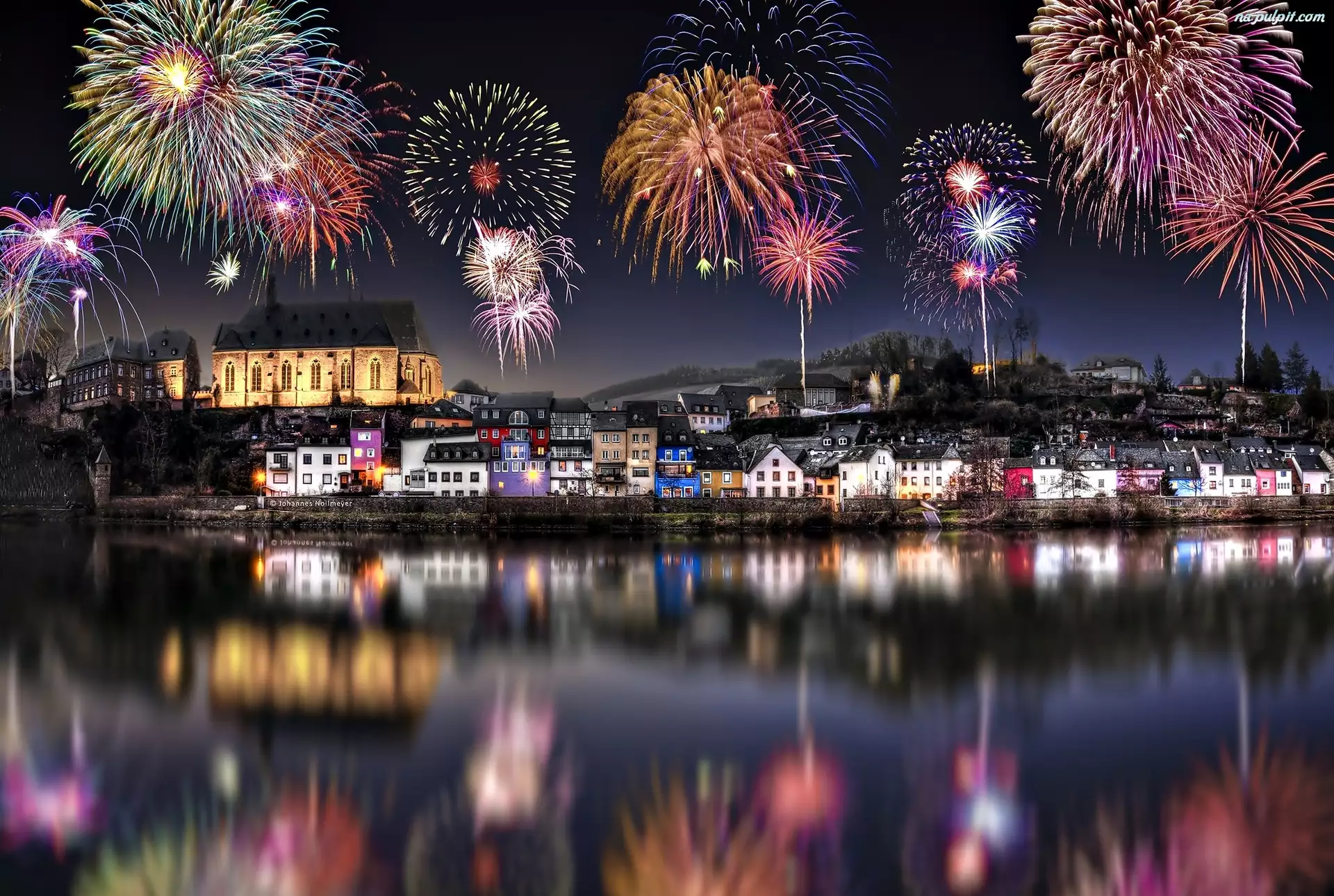 Odbicie, Nowy Rok, Noc, Miasto, Fajerwerki