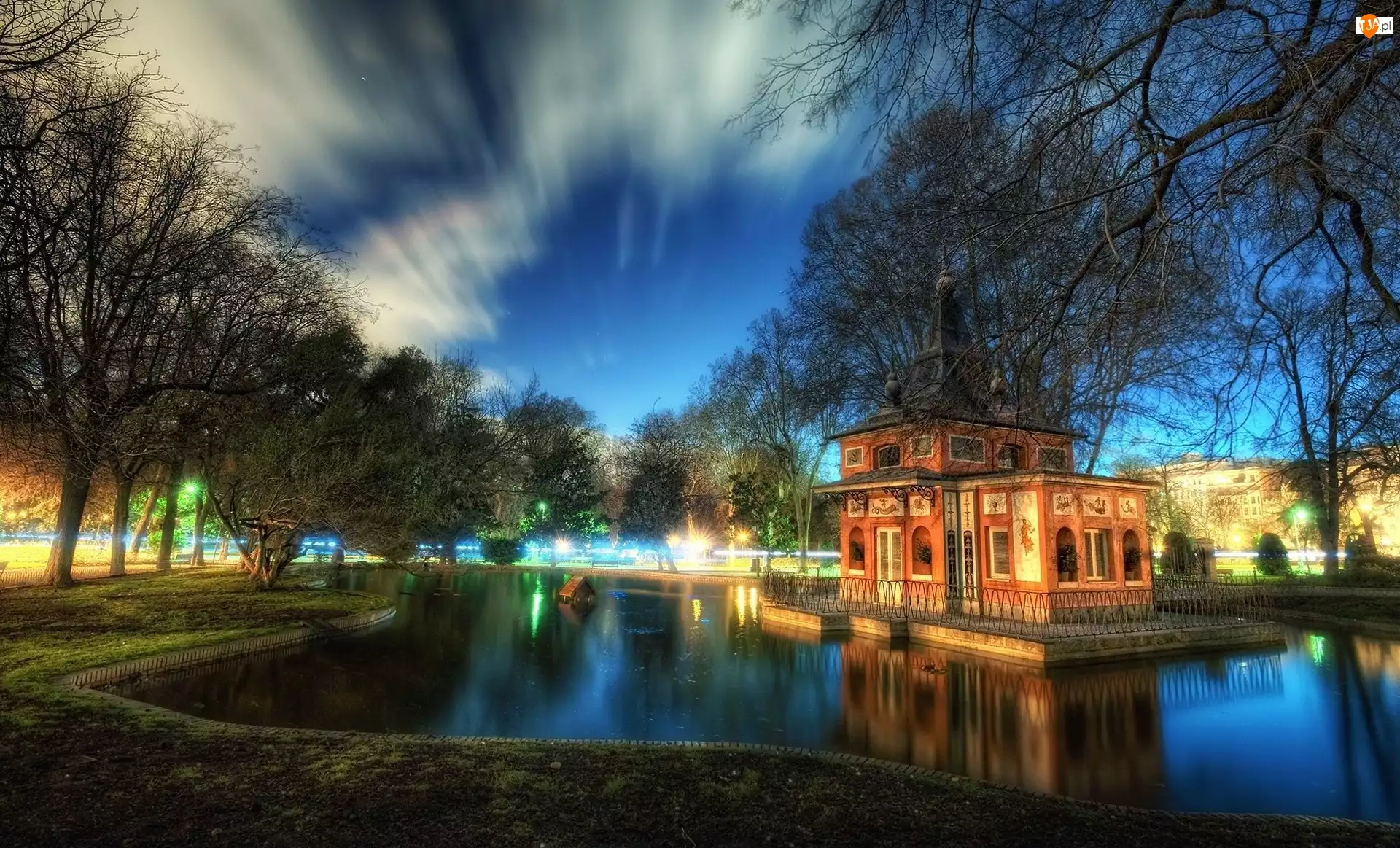 Odbicie, Park, Drzewa, Jeziorko, Domek