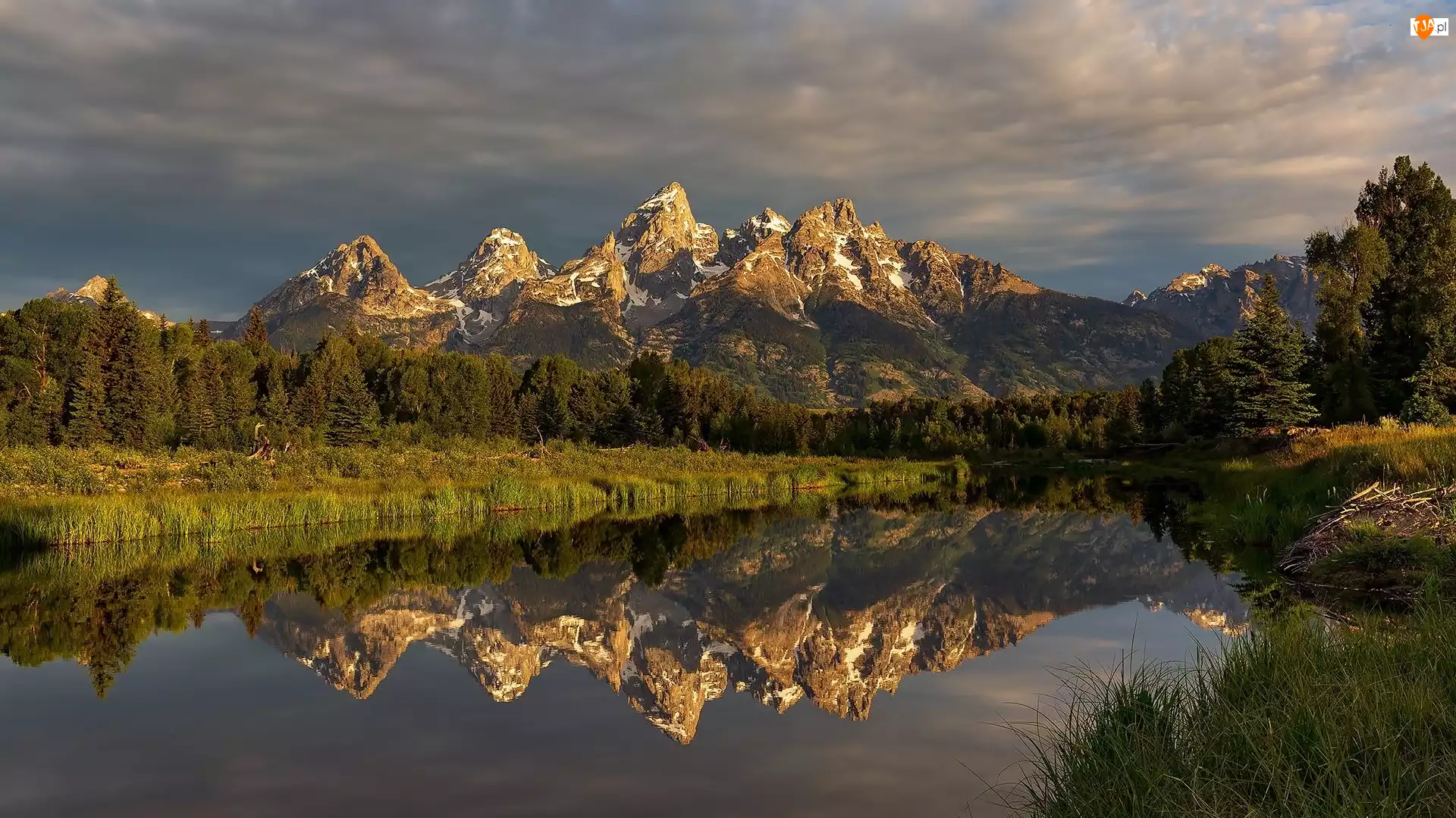 Odbicie, Park Narodowy Grand Teton, Góry, Stan Wyoming, Jezioro, Teton Range, Stany Zjednoczone, Drzewa
