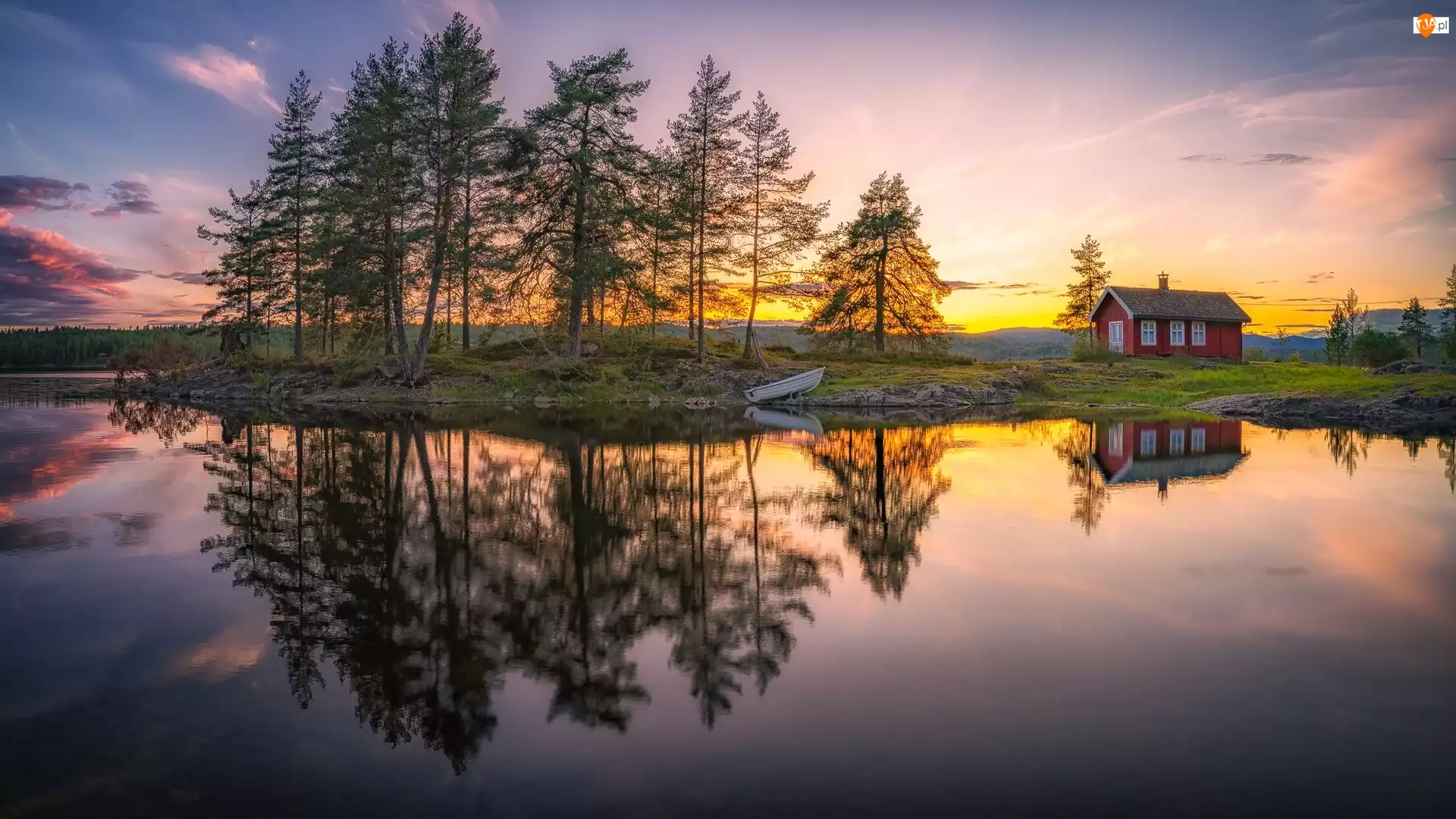 Odbicie, Ringerike, Łódka, Drzewa, Dom, Tyristrand, Jezioro, Norwegia, Vaeleren