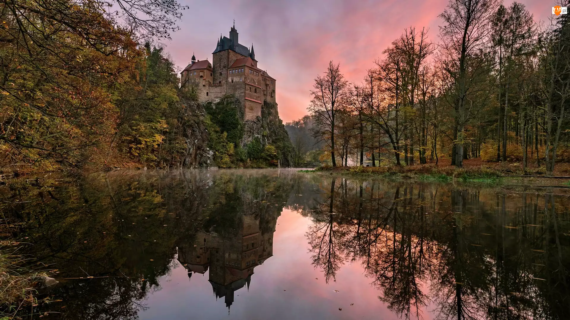 Odbicie, Zamek Kriebstein, Różowe, Kriebstein, Jezioro, Niebo, Niemcy, Drzewa