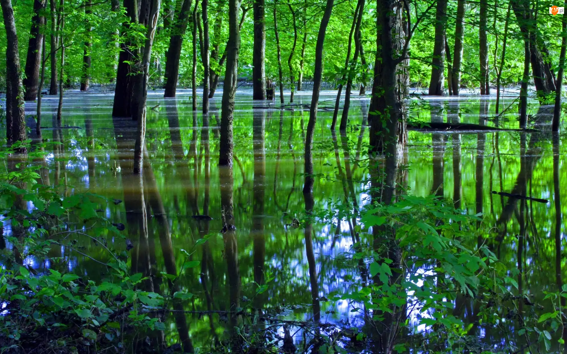 Drzewa, Odbicie, Las, Zatopiony, Wiosna