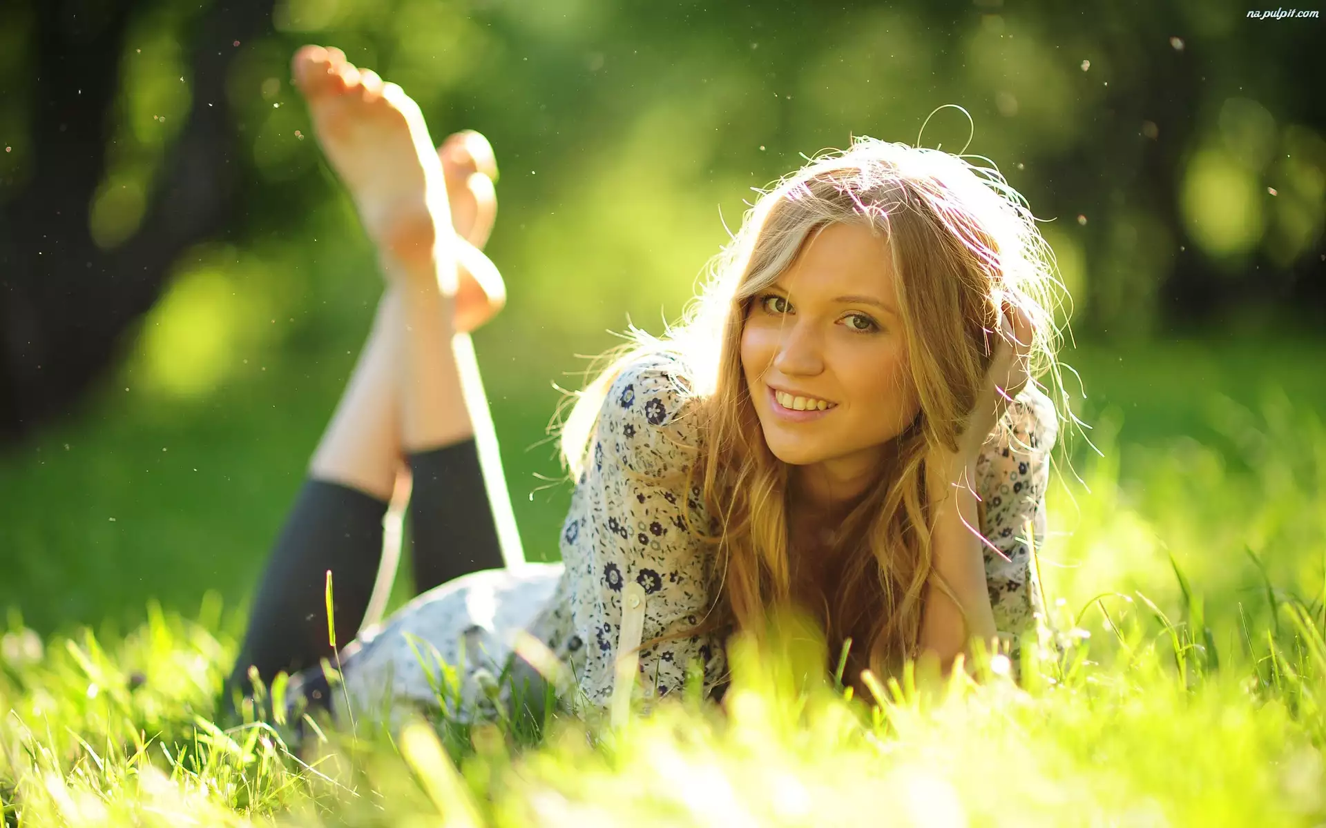 Odpoczynek, Piękna, Blondynka, Kobieta, Trawa