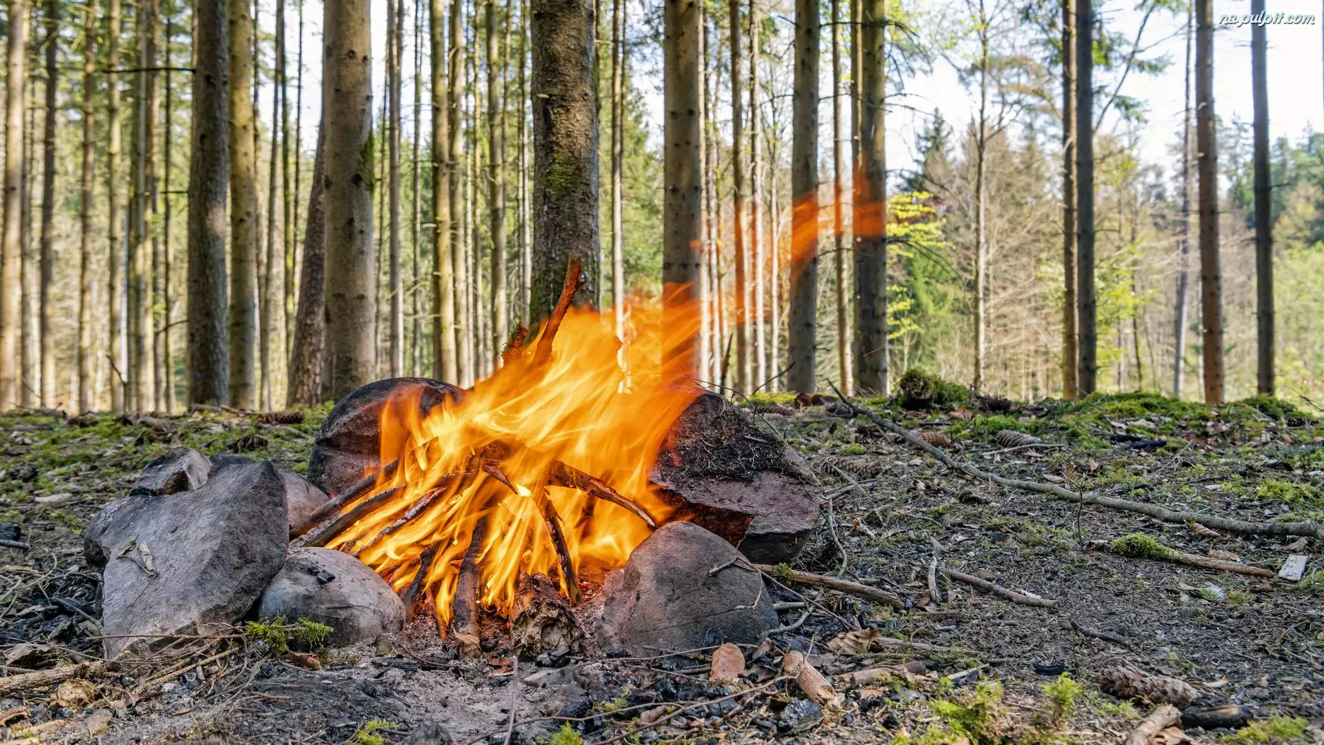 Drzewa, Ściółka, Drewno, Las, Kamienie, Płomień, Ognisko