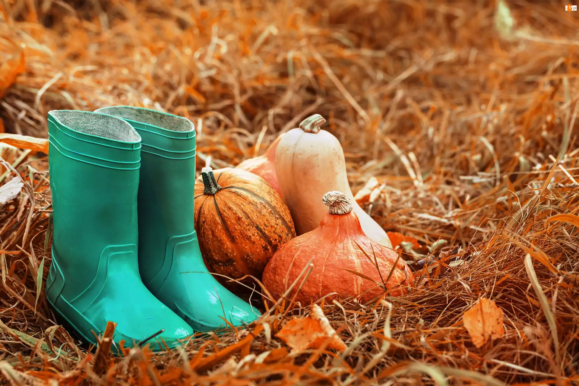 Ogród, Jesień, Dynie, Liście, Kalosze, Trawa