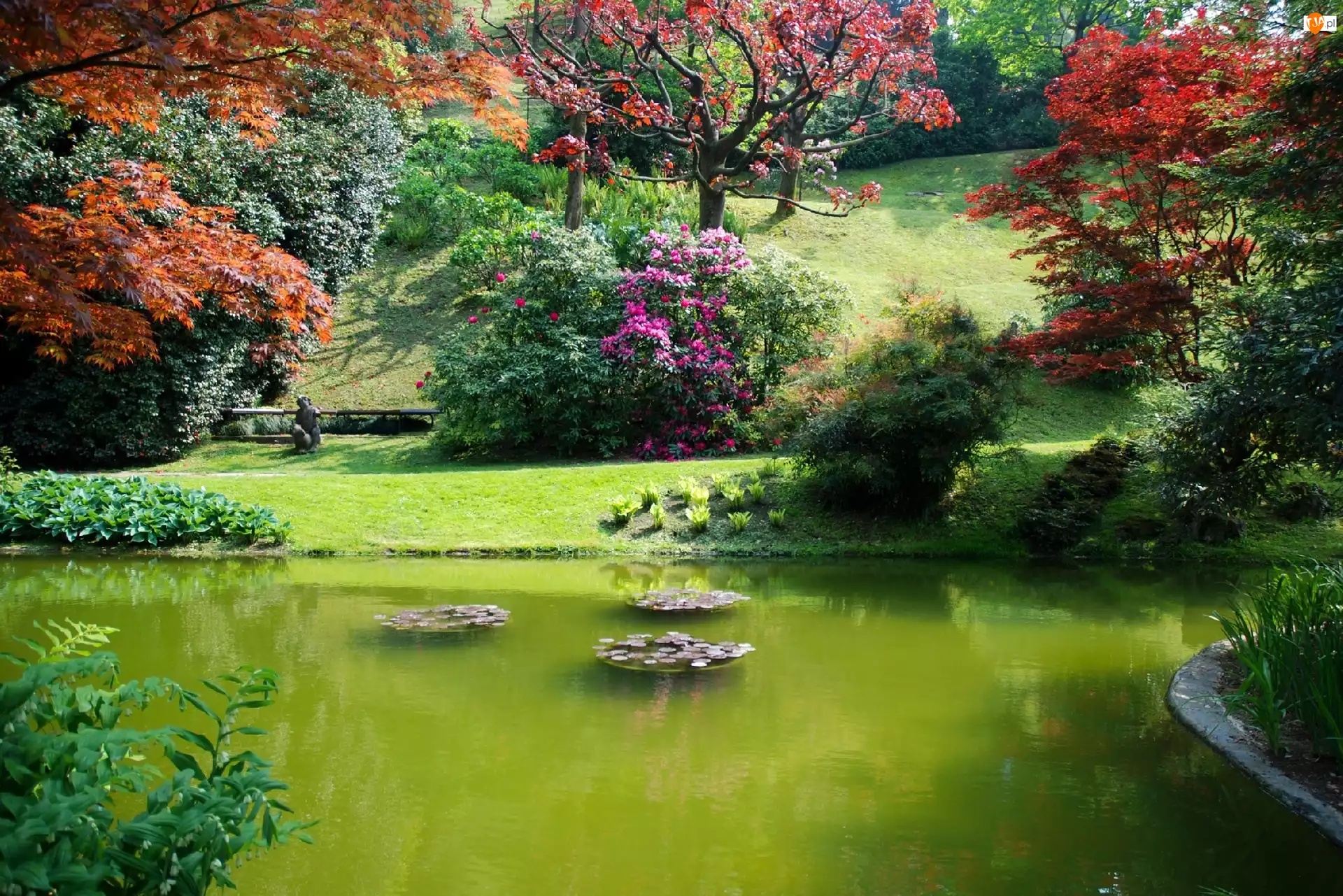 Staw otoczony ogrodem, roślinami, kwiatami.