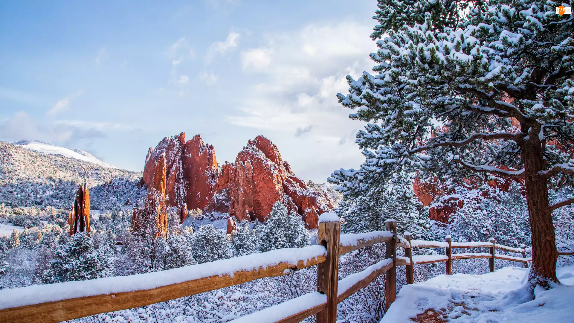 Garden of the Gods, Zima, Sosna, Kolorado, Góry, Ogrodzenie, Stany Zjednoczone, Drzewo
