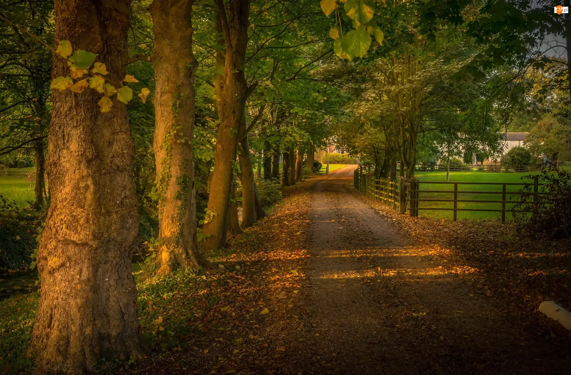 Ogrodzenie, Jesień, Drzewa, Park, Droga