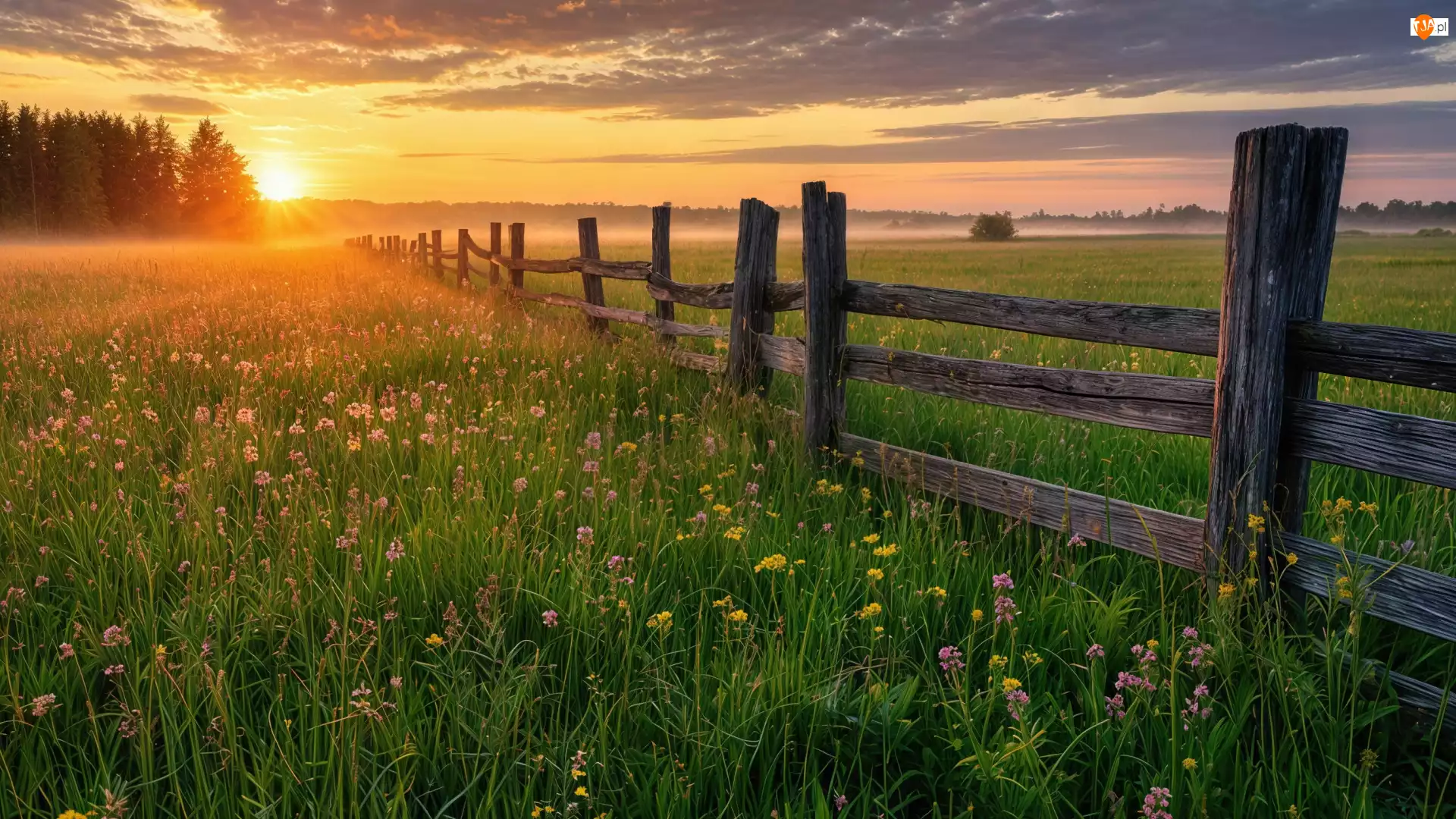 Ogrodzenie, Łąka, Mgła, Wschód słońca, Kwiat