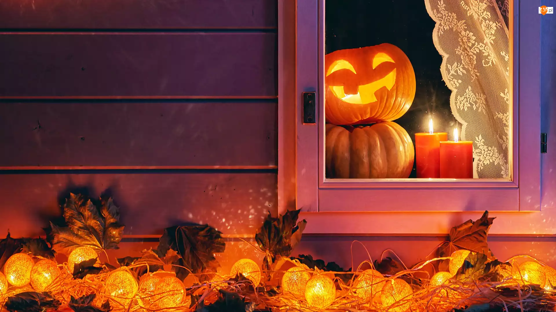 Okno, Lampki, Halloween, Dekoracja, Dynie, Świece