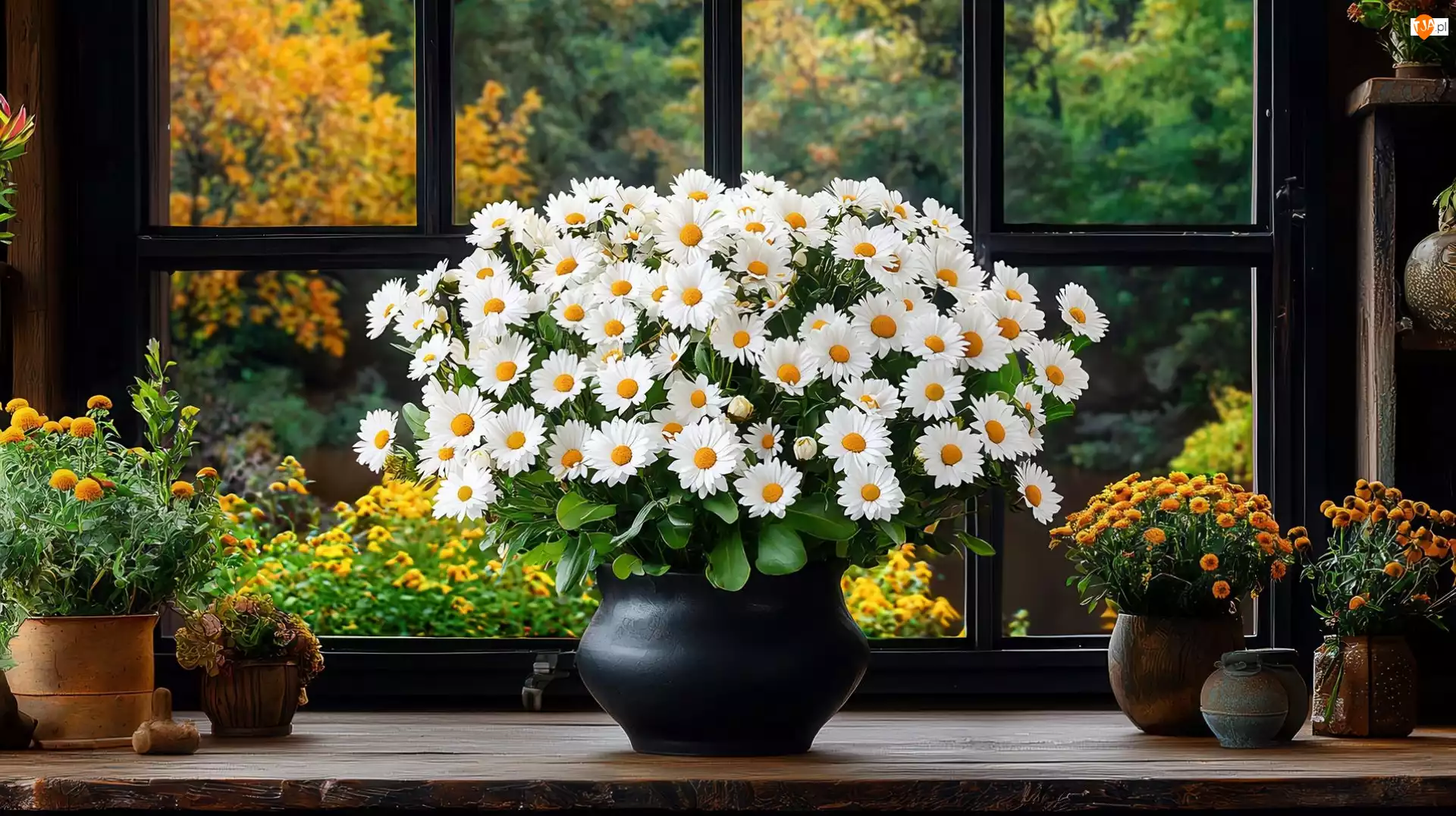 Okno, Stół, Wazony, Kwiaty, Parapet