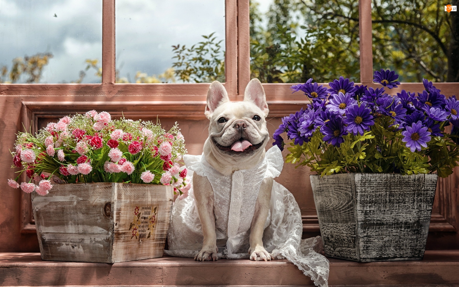 Okno, Suczka, Kwiaty, Sukienka, Doniczki