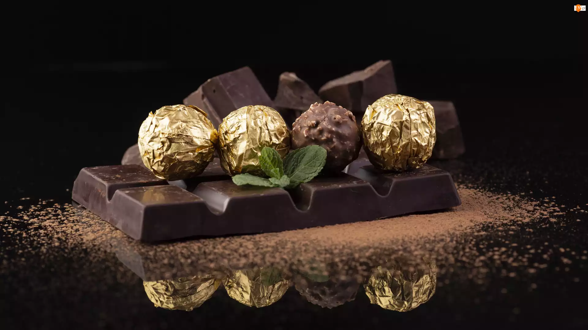 Kompozycja, Odbicie, Liść, Tło, Czekolada, Słodycze, Kakao, Ferrero Rocher, Czarne, Mięta
