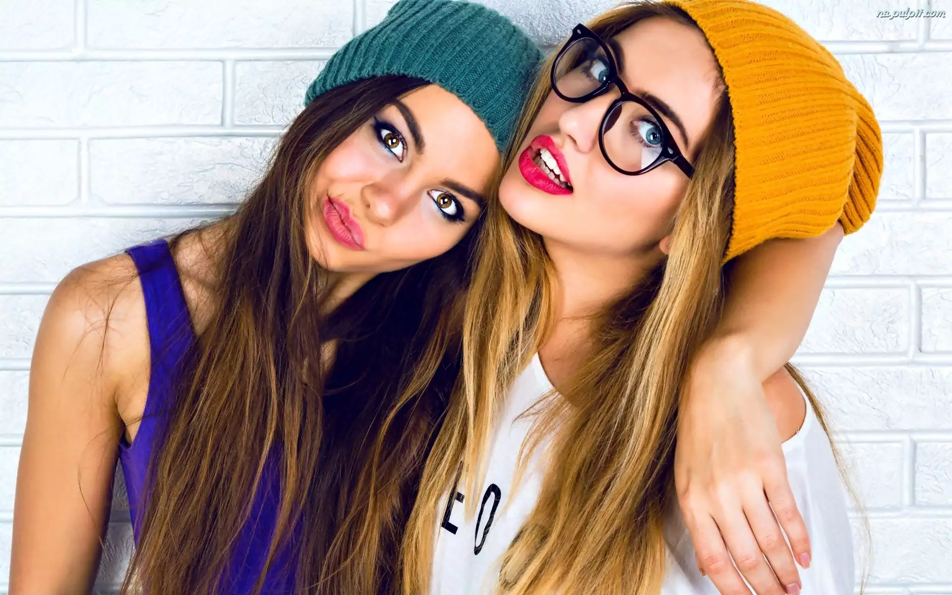 Okulary, Dwie, Makijaż, Kobiety, Czapki